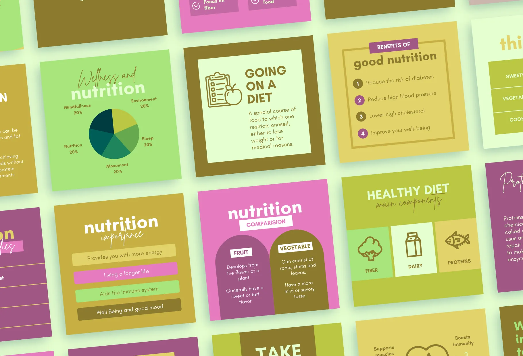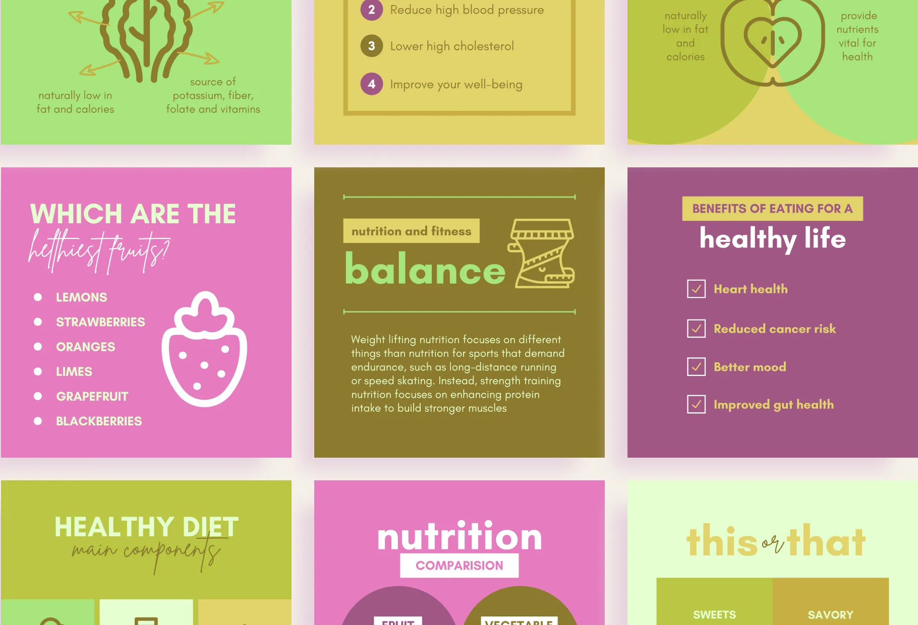 Are you a Nutritionist or Meal coach on the hunt for fresh and engaging content, to promote your services without breaking the bank or hassling with an expensive designer? I'm here to say, you can stop looking now! My 20 Nutrition Infographics Instagram Posts Fully Editable Canva Templates V2 take the thought out of creating content and replaces it with versatility through professionally optimized and 100% customizable graphics. The best part? This template pack comes with usable real text in the form of nutrition tips, meal plans and so much more, so that you can show up as an authority in your industry and with no design skills necessary. Oh, and if my playful and fresh trendy green colorway isn't your thing, you can easily edit my templates thanks to Canva’s easy-to-use web app and boast scroll-stopping content whilst reclaiming your precious time in the process. Download my 20 Nutrition Infographics Instagram, Posts Fully Editable Canva Templates V2 and you’ll be turning followers into paying clients in no time!