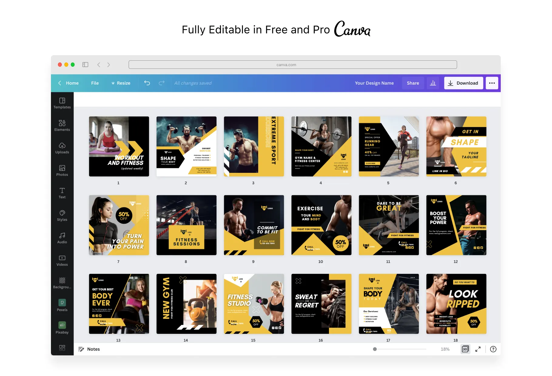 So you’re good at helping others shape their life with your fitness know-how, well let me help you shape your social media feed with my 30 Fitness Instagram Engagement Post Canva Templates. My templates are h=just the marketing tool you need to level up your social media presence, all without the need to hire a social media manager. Thank’s to Canva’s easy-to-use platform, you can easily customize the design features of each template to better suit the aesthetics of your brand. This template pack has also been professionally optimized with usable real text so, from the moment you decide to invest in the growth of your brand by using my templates, they’ll be ready for your feed in an instant. Be bold and challenge your audience to be the best version of themselves through your content by downloading my 30 Fitness Instagram Engagement Post Canva Templates now!