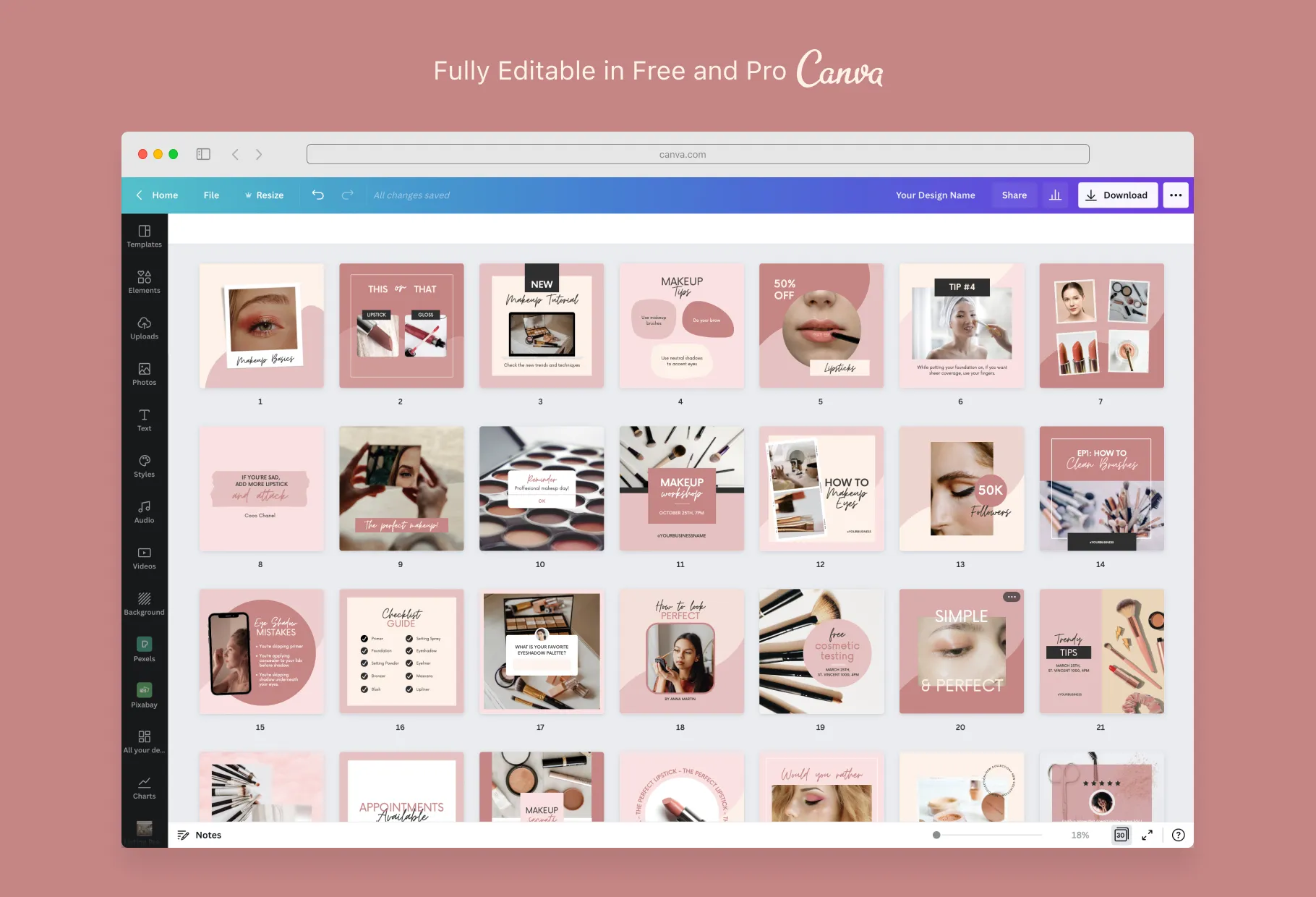 Draw clients near and far to your Makeup Business by making use of my 30 Makeup Instagram Post Canva Templates. An artist like you should be spending time on their business, not spending countless hours crafting marketing content that might not convert. That’s where my Makeup Templates step in, this template pack has been professionally optimized with 100% customizable design features and is editable via Canva’s easy-to-use platform. The best part? You won’t need to hassle with hiring an expensive designer or getting yourself a Canva Pro account. That’s because I only use original design elements so you can be sure that what you’re getting is high-quality and is sure to set your makeup business apart. So whether you’re an MUA on the rise or a brand looking to promote your latest palette, download my 30 Makeup Instagram, Post Canva Templates now and turn followers into paying customers.