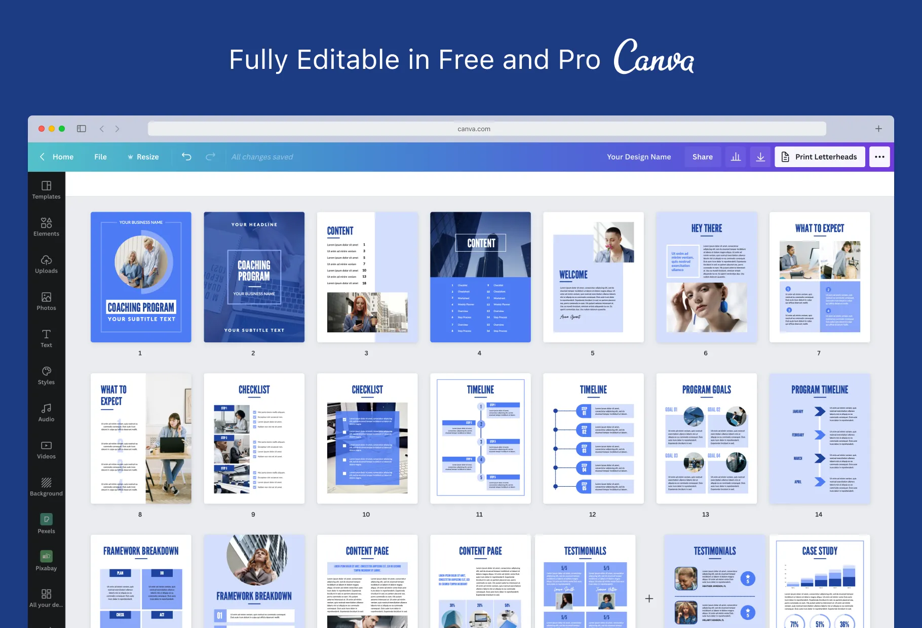 If you're looking to create a successful coaching program, these Canva templates will make your life a whole lot easier. The set includes pages for outlining what clients can expect from your program, timelines, framework breakdowns, case studies, pricing packages, and more. In other words, it has everything you need to get your coaching program off the ground and growing like never before. And because it's all in Canva, you can easily customize the look and feel to match your brand. So why wait? Get started on building your dream coaching business today.
