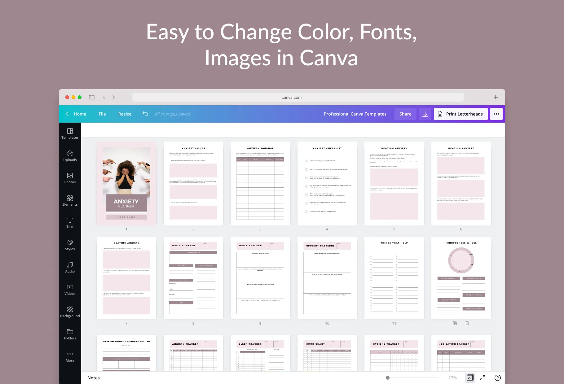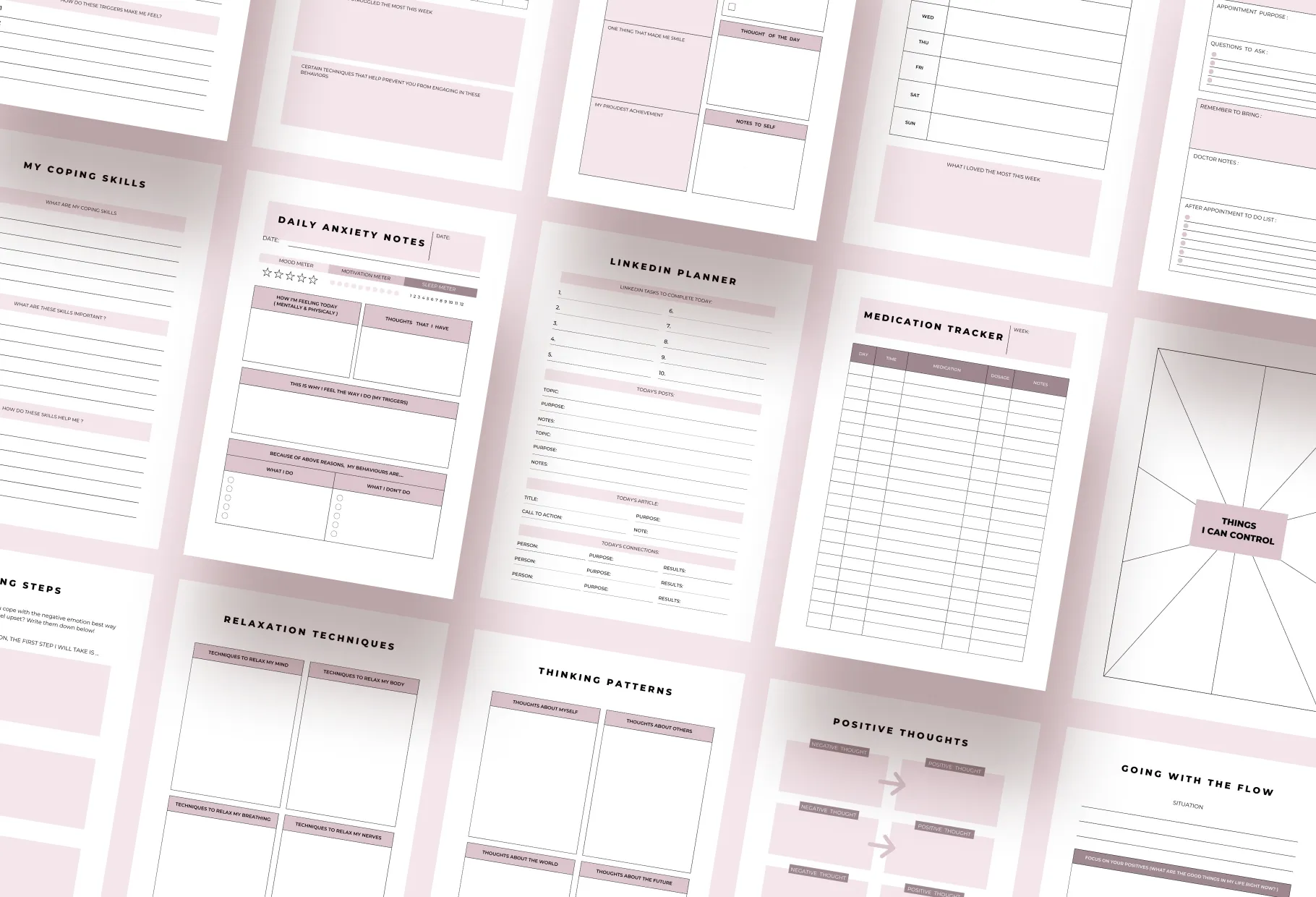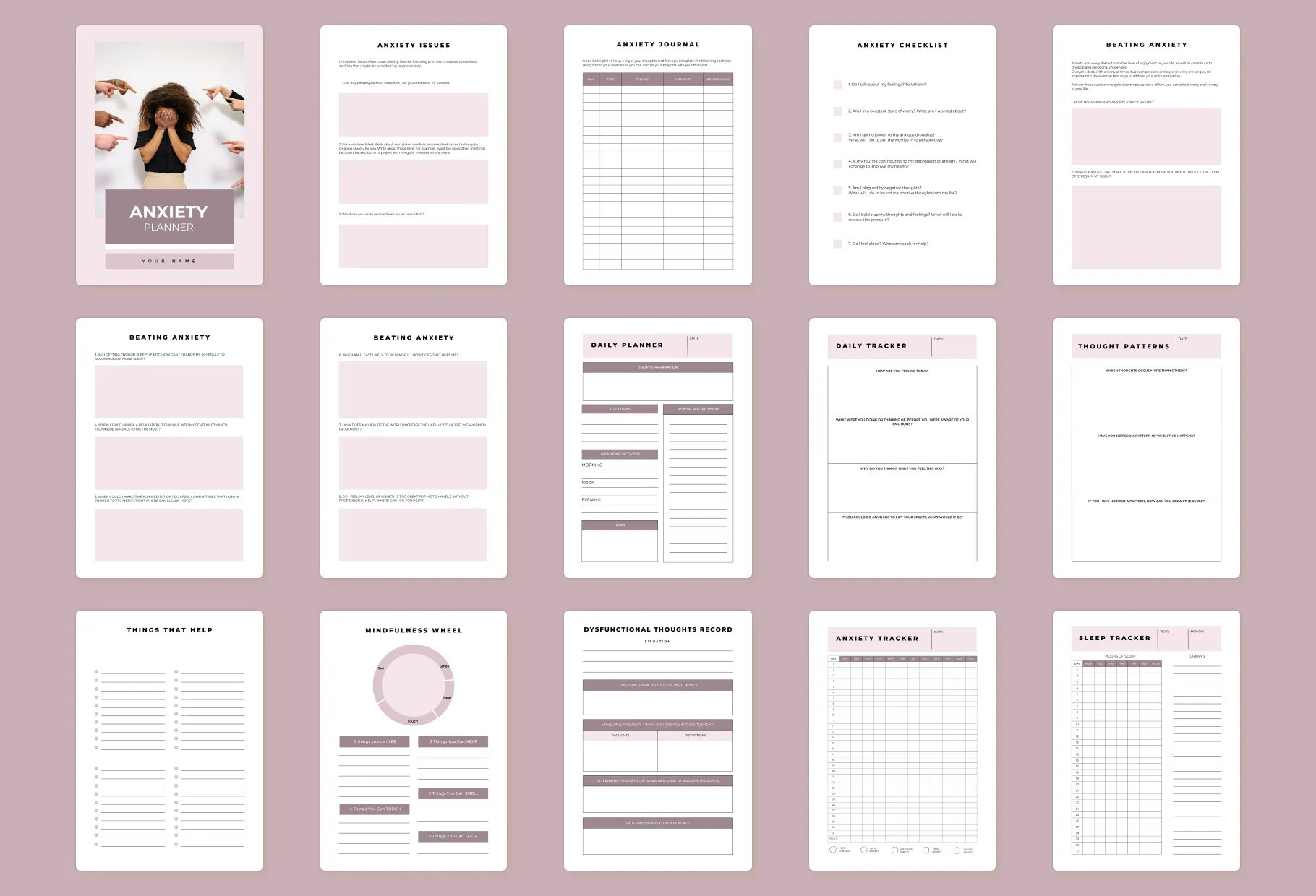 Do you feel overwhelmed with anxiety? Or are you a therapist looking for an effective solution to help your clients battle their anxiety? If you are, I’m happy to share that I made this Anxiety Planner Canva Template with you in mind. It can be used both by those dealing with anxiety directly or by professionals like therapists and psychologists seeking an effective tool for assisting their clients in managing this issue. This planner is more than just a regular organizer – it’s an all-in-one resource designed to help manage and track anxiety while promoting mindfulness and gratitude. It comes loaded with pages and prompts, and customizable tools specifically created to offer practice solutions against anxiety. And because it’s made with Canva, you have complete freedom to personalize and edit the planner to perfectly fit your needs. With its user-friendly design, every page will make it easier for you or your clients to focus on overcoming anxious feelings. For anyone seeking efficient ways of managing their own mental health or aiding others in recovery from anxiety, this Anxiety Planner Canva Template is exactly what you need. Anxiety Issues Anxiety Journal Anxiety Checklist Seating Anxiety Thought Patterns Daily Tracker Beating Anxiety Things That Help Mindfulness Wheel Dysfunctional Thoughts Record Anxiety Tracker Mood Chart Hygiene Tracker Medication Tracker Appointments Gratitude My Coping Skills Understanding Triggers Behavior Tracker Daily Anxiety Notes Daily Self-Care Coping Steps Relaxation Techniques Thinking Patterns Positive Thoughts Going With The Flow