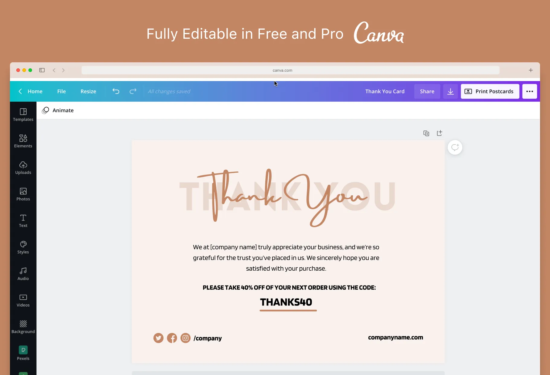 Thank You Cards are the best way to keep your customers coming back for more! Most sellers are too busy running their businesses to take time out for sending thank-you cards after every sale. A small gesture like sending a thank you card can make all the difference in how your customer feels about their purchase, and if they'll return again! This is especially important when selling online or on marketplaces where it's harder to build trust and rapport with buyers. Inserting a Thank you Card is a great way to show that you care about them and their experience with your business. But, designing the perfect card can be hard! This printable template will save you hours of time – just download the template file, import it to your free Canva account, fill in the blanks, add your logo, customize colors, fonts, or text styles without hiring someone else to do it for you! - It's super easy even if you don't have graphic design skills! Encourage repeat sales with this professional-looking thank you card for CANVA. This listing is for the digital files only*** No physical product will be sent.