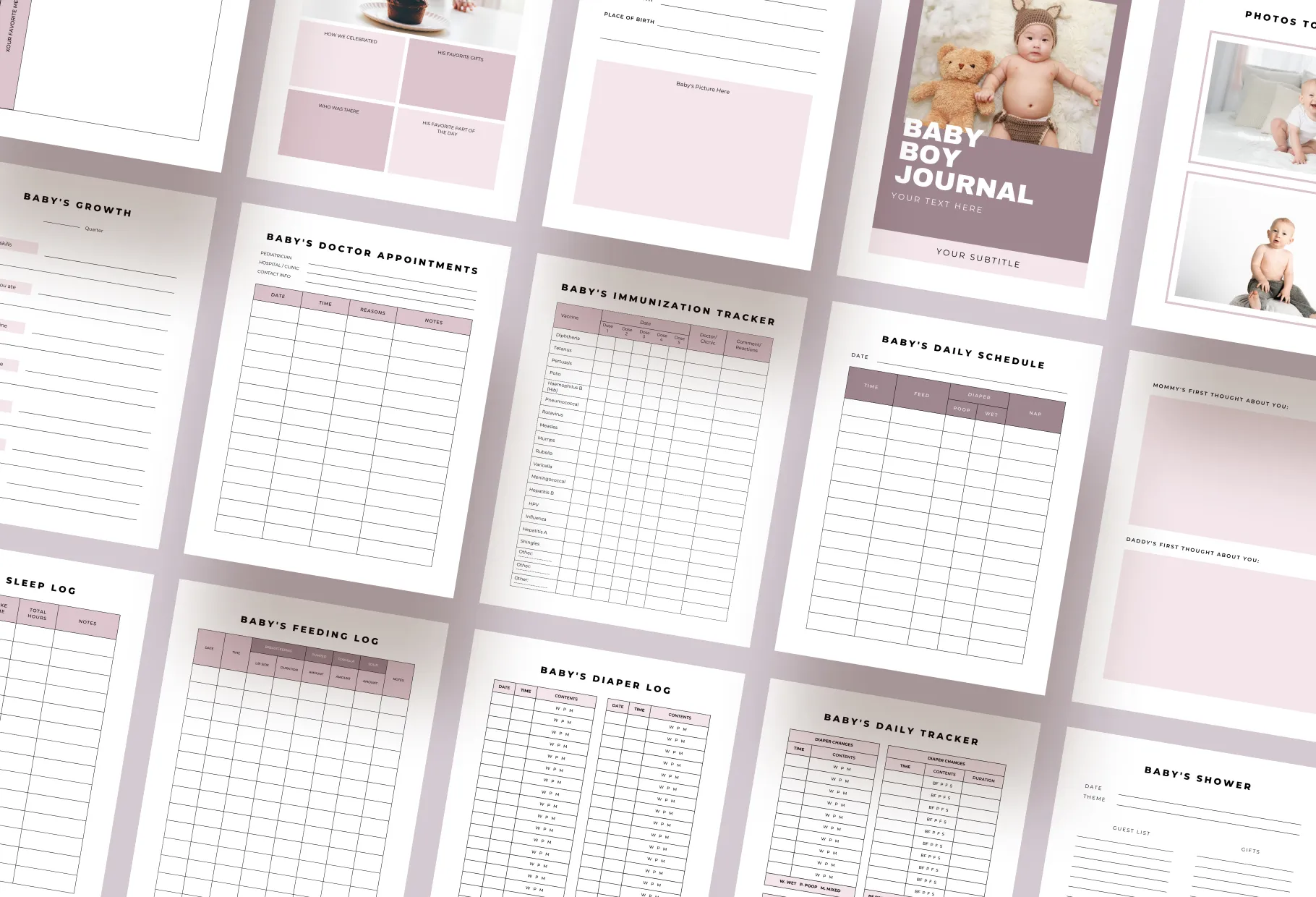 Welcome new moms and dads! Are you looking for a way to keep track of all those special milestones in your baby boy’s life? Not just the first steps and birthday, but also his health and wellness? If yes, I’ve got the perfect thing for you. I made this Baby Boy Journal Canva Template with you in mind. Whether you’re a pediatrician or a busy mom or dad trying to keep up with every important stage of your baby boy’s life, this journal will help. It comes with built-in logs like sleep, diaper, medication, and feeding logs, as well as customizable pages that allow you to tailor each page to fit his unique personality. With the Baby Boy Journal Canva Template, it’s easy to stay organized while capturing those precious moments. Get yours and preserve every milestone and big moments of your little one forever! This Book Belongs To Family Tree Photos to Remember Baby’s Shower Baby’s Daily Schedule Baby’s Daily Tracker Baby’s Daily Log Baby’s Feeding Log Baby’s Sleep Log Baby's Growth Baby’s Birthday Baby’s First Year Baby’s Wellness Checkup Baby’s Doctor Appointments Baby’s Immunization Tracker Baby’s Growth Chart Baby’s Teeth Growth Chart Baby’s Medication Tracker Baby’s Symptoms Tracker Baby’s Milestones Baby’s Milestone Tracker Baby’s First Baby’s Shopping List Baby’s Events Page Babysitter’s Guide Baby’s Notes