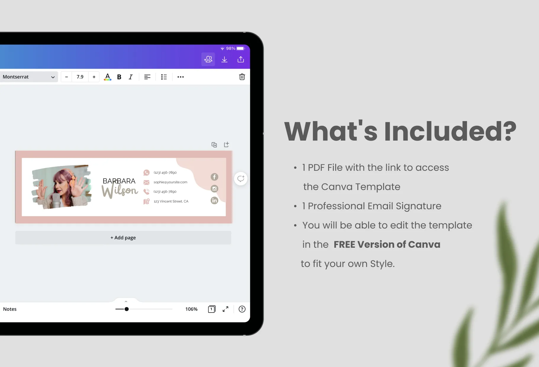 This professional email signature is easy to edit and ready to go! It’s perfect for anyone who wants their emails to look great. Simply drag and drop your headshot, fill in your information… and voilá! You can be on your way with a beautiful new email signature that will impress everyone you send it to. With this template, you won't have any more boring signatures or generic templates again. Your friends and clients will think you spent hours creating something so professional when really all it took was a few minutes in Canva! Download now!