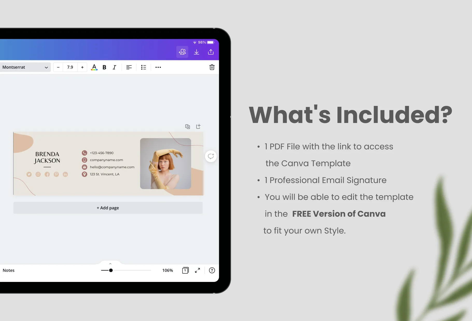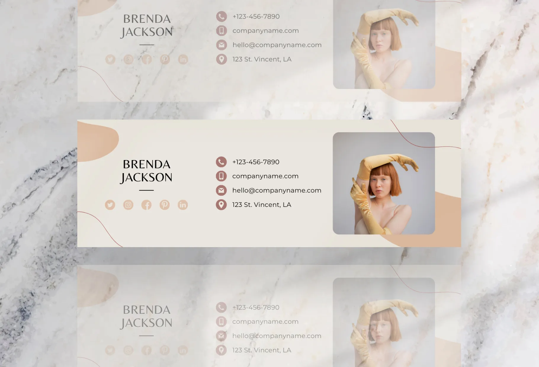 This professional email signature is easy to edit and ready to go! It’s perfect for anyone who wants their emails to look great. Simply drag and drop your headshot, fill in your information… and voilá! You can be on your way with a beautiful new email signature that will impress everyone you send it to. With this template, you won't have any more boring signatures or generic templates again. Your friends and clients will think you spent hours creating something so professional when really all it took was a few minutes in Canva! Download now!