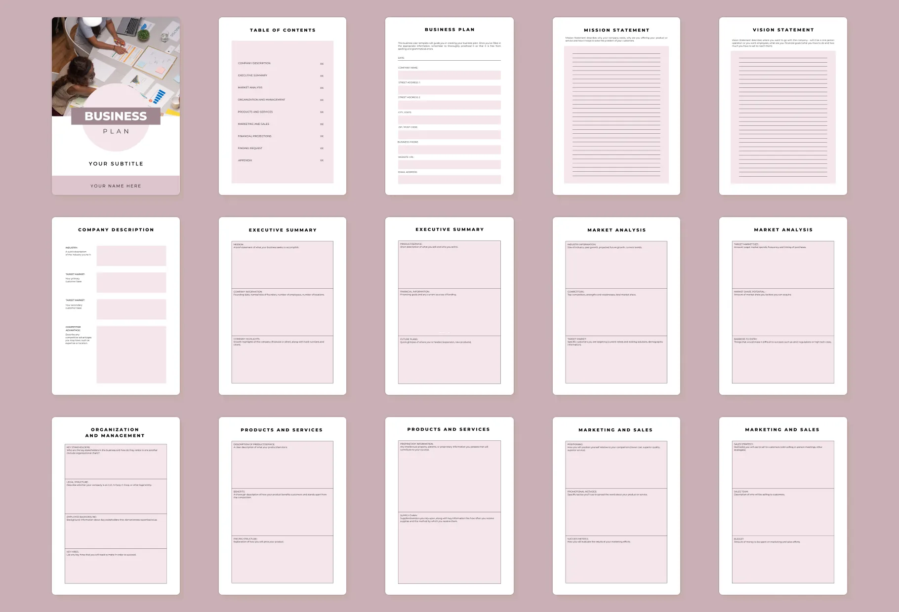 I know the struggle of starting and managing a business. It's like trying to untangle a giant ball of yarn - you're not sure where to begin or what to tackle first. That's why I created this Business Plan Canva Template. I wanted to give you an easy-to-use, super organized tool that will help you navigate the complex world of business planning, management, and finance. Imagine having a clear roadmap for your business right at your fingertips. No more sifting through hundreds of documents, no more stress about forgetting important tasks, and no more scrambling at the last minute to put together a coherent business plan. With my Canva Template, you have everything you need in one place. This Business Plan Canva Template is a comprehensive package designed with a business owner's needs in mind. It contains detailed pages for Table of Contents, Business Plan, Mission Statement, Vision Statement, Company Description, Executive Summary, Market Analysis, Organization and Management, Product and Services, Marketing and Sales, Financial Projections, Profit and Loss, Funding Request, Future Goals, Investment Tracker, Net Worth Tracker, Notes, and much more. It's a virtual roadmap to guide you every step of the way! Who can benefit from this Business Plan Canva Template? 1. Startups looking to solidify their business plan and impress investors 2. Small business owners aiming to keep their finances in check and plan for the future 3. Consultants needing a professional and organized way to present their business plans 4. Non-profit organizations seeking clarity in their mission and financial planning 5. Coaches and mentors needing a comprehensive tool for their clients 6. And anyone else who wants to make their business life easier and more structured! Don't let the chaos of business planning slow you down. My Business Plan Canva Template can help you streamline your processes, plan for success, and keep track of your goals and finances in a structured, orderly fashion. I invite you to download the template and start organizing your business today. You won't regret it!