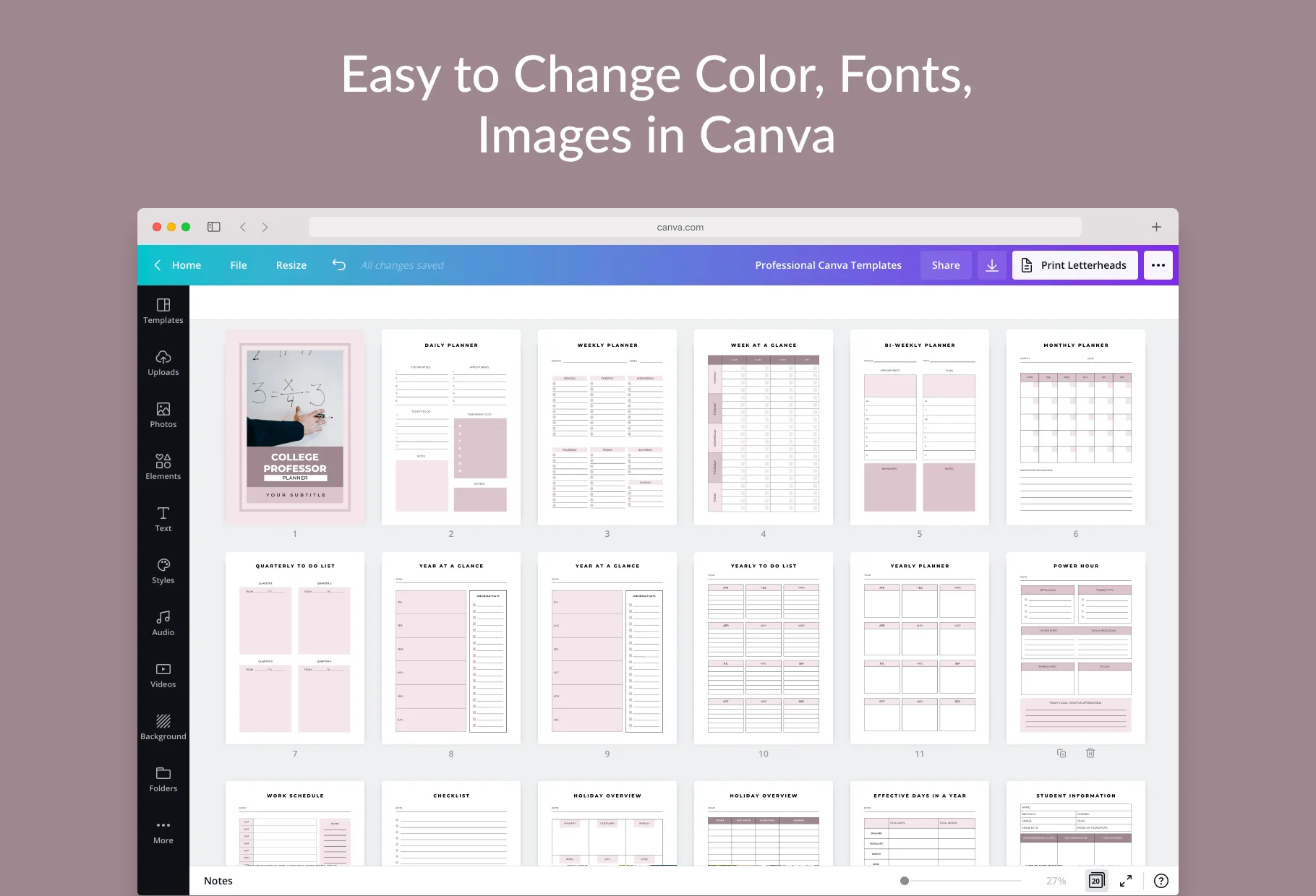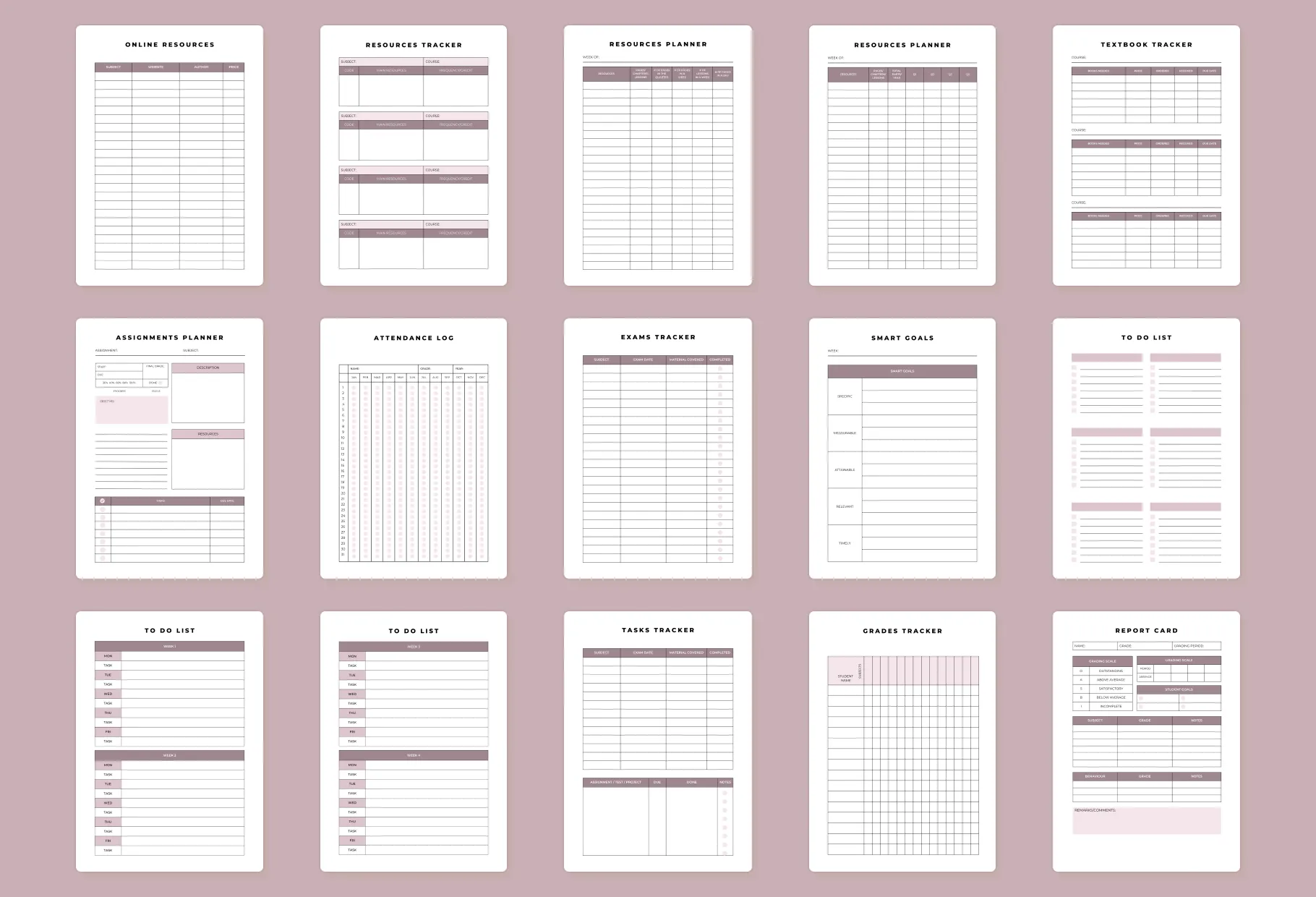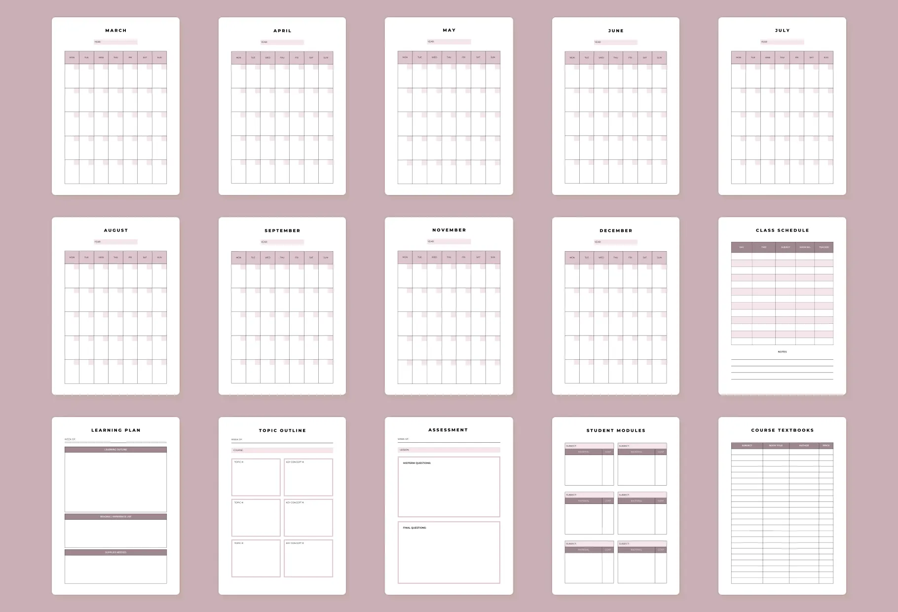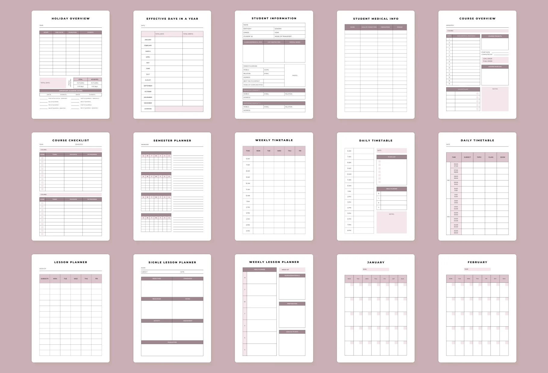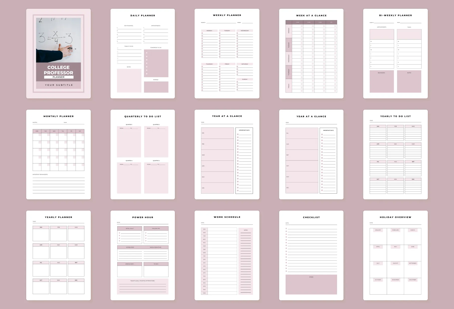 Are you a college professor feeling overwhelmed at the thought of planning out your entire year? Do you need more organization when it comes to organizing and streamlining all your activities, student information, and extra-curricular work? Look no further than my College Professor Planner Canva Template! I made this all-in-one planner with you in mind and it’s like having a personal assistant solely dedicated to helping make your life as a college professor easier. From daily, weekly, and monthly planners, to work schedules, checklsits, holiday overviews, course checklists, semester planenrs and so much more – this template has everything you need to plan out your school year. And it’s totally customizable because it’s made with Canva – so you can repurpose it for whatever new school year brings. Daily Planner Weekly Planner Week at a Glance Bi-Weekly Planner Monthly Planner Quarterly To-Do List Year at a Glance Yearly To-Do List Yearly Planner Power Hour Work Schedule Checklist Holiday Overview Course Checklist Semester Planner Effective Days In A Year Student Information Student Medical info Course Overview Weekly Timetable Daily Timetable Lesson Planner Single Lesson Planner Weekly Lesson Planner January to December Calendar Assignment Planner Textbook Tracker Report Card Academic Accomplishment Field Trip Priority Matrix Resources Planner Resources Tracker Student Modules Learning Plan Topic Outline Assessment Class Schedule Course Textbooks Online Resources Tasks Tracker To-Do List Attendance Log Grades Tracker Exams Tracker SMART Goals
