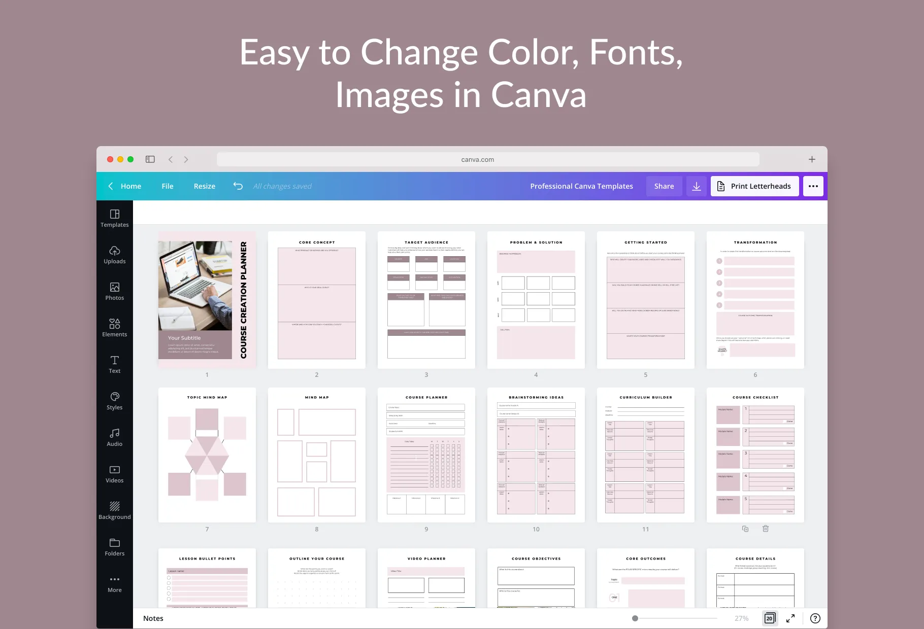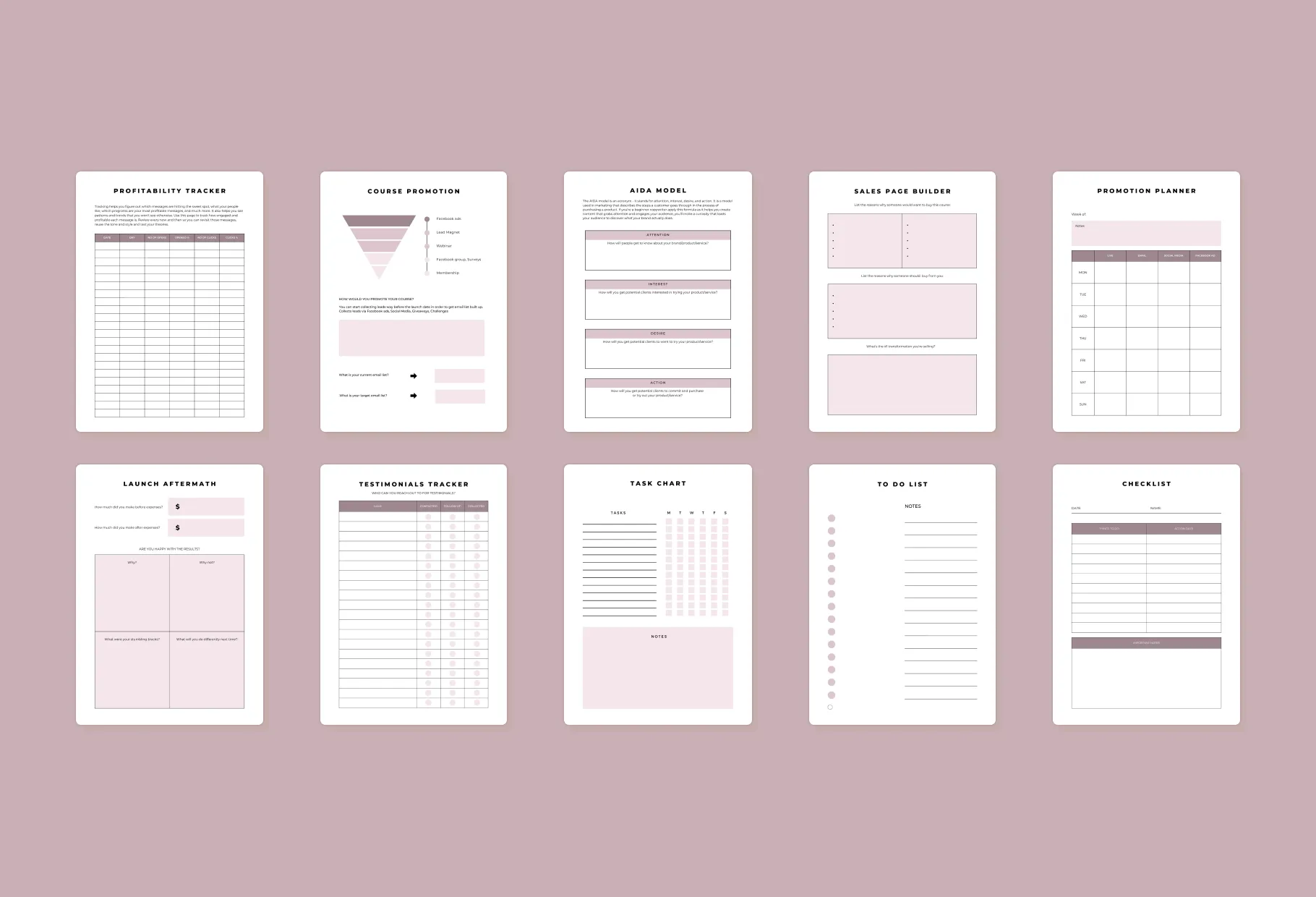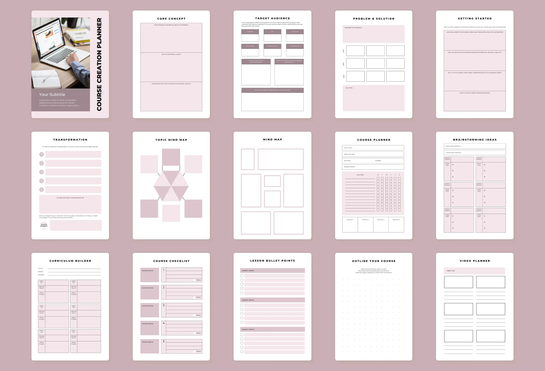 The struggle is real. Navigating the complex process of course creation can be daunting. You're brimming with passion and knowledge that you're eager to share, yet there's a challenging maze between your ideas and a polished, successful online course. The Course Creation Planner Canva Template is here to be your guide through this wilderness. Just imagine, waking up, fired up to develop your course, with a clear idea of the next steps. No more overwhelming uncertainty, no more precious time wasted. Instead, you have a lucid roadmap leading straight to your finished, professional course. It's not a dream, it's possible with the Course Creation Planner Canva Template. You might be questioning, "Is this template suitable for me?" Well, this template is incredibly versatile and useful for a variety of people: 1. Budding course creators wanting to turn their passion into a profitable course 2. Seasoned course creators seeking a more streamlined, organized course planning process 3. Coaches, consultants, or experts aiming to scale their business through online courses 4. Anyone blessed with specialized knowledge or skills they're excited to share with the world The Course Creation Planner Canva Template is brimming with all the resources you need to plan, organize, and execute your course creation strategy. It features an exhaustive list of pages, including: Core Concept Target Audience Problem and Solution Getting Started Transformation Topic Mind Map Mind Map Course Planner Brainstorming Ideas Curriculum Builder Course Checklist Lesson Bullet Points Outline Your Course Video Planner Course Objectives Core Outcomes Course Details Bonuses What's In It For Me Filling In The Gaps Live Brain Dump Lesson Scripts FAQS Builder Sales Funnel Strategy Course Ingredients Free Opt-In Launch Emails Follow Up Formula Grow Your List Profitability Tracker Course Promotion AIDA Model Sales Page Builder Promotion Planner Launch Aftermath Testimonials Tracker Task Chart To Do List Checklist Notes You've already done half the work - you've got the expertise, the teaching spirit, and the boldness to share your ideas with the world. What's missing now is a structured method to turn your knowledge into an empowering course. The Course Creation Planner Canva Template can fill this gap. Don't put your course creation journey on hold any longer. It's time to download the template and start transforming your dreams into reality.
