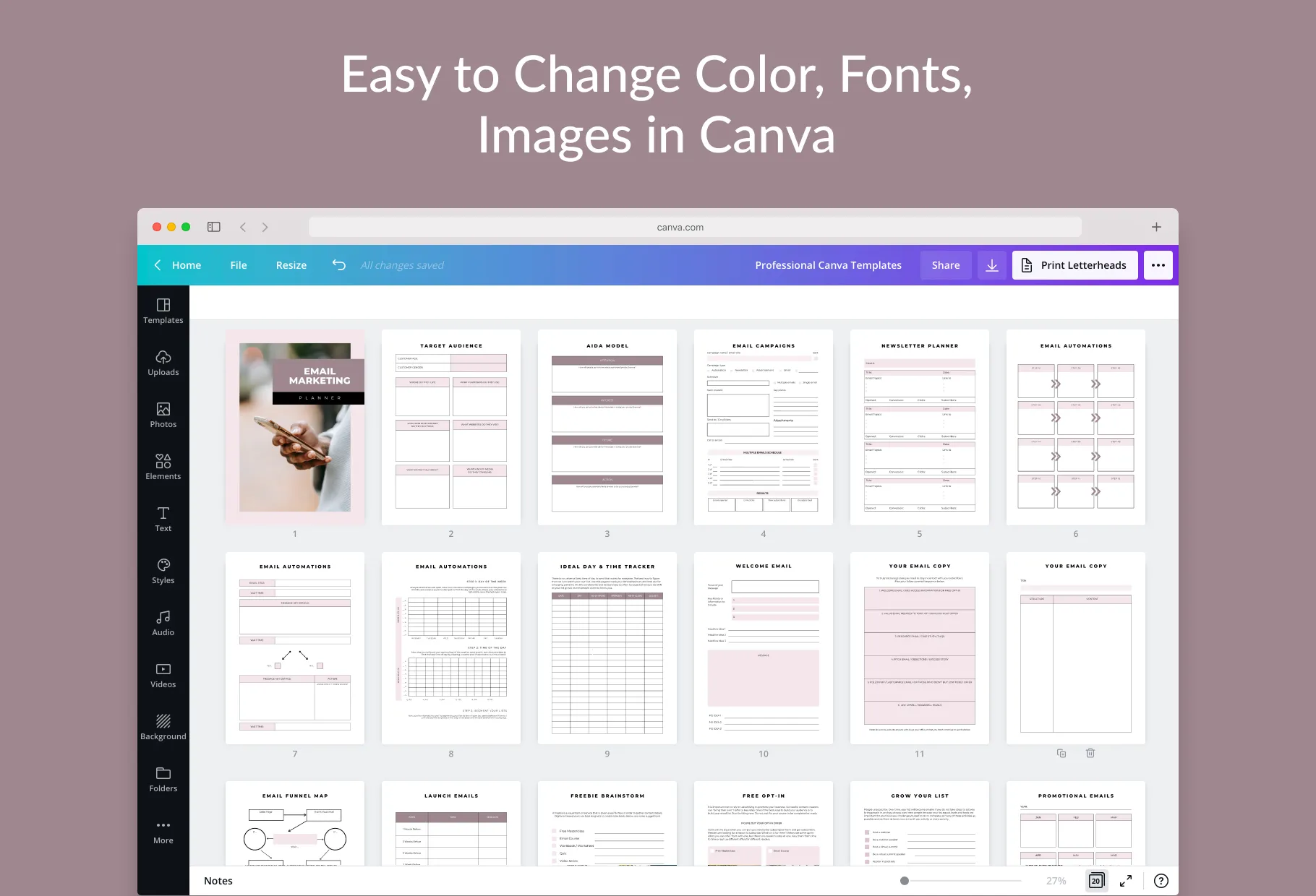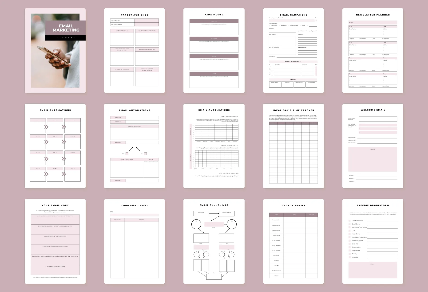 Ever feel like you're shooting in the dark when it comes to your email marketing? Like there's no strategy behind your campaigns, and you're just hoping something sticks? That used to be me until I developed my Email Marketing Planner Canva Template. This Planner is designed to address the pain of disorganized email marketing. Instead of spending hours figuring out what to send, when to send it, and to whom, all of that information is at your fingertips. My Planner turns the complexity of email marketing into a manageable task. With pages like the Target Audience and AIDA Model, you'll have a clear roadmap to success. And it's not just a plan—it's a way to monitor your progress, too. You can track your most productive days and times, your revenue, and even the effectiveness of your welcome emails and freebies. Here's what you'll get: - Agony-free email campaign planning - Clear communication with your subscribers - Data-driven results - Increase in profitability - Effective scheduling and organization This planner isn't for everyone. It's for you if you're: - A small business owner or solopreneur - An online course creator - A social media manager - A digital marketer - A blogger - An e-commerce store owner In essence, it's for anyone who wants to streamline their email marketing efforts and get better results. So, let's put an end to the disorganization and lack of strategy. With my Email Marketing Planner Canva Template, you can create a clear, effective, data-driven email marketing strategy. Don't wait for success to find you. With this planner, you'll go out and find it yourself. To get started, all you need to do is download the template and start organizing your email marketing. The benefits of using this planner will be apparent from the very first use. So, are you ready to level up your email marketing game? Download my Email Marketing Planner Canva Template now! Here's a list of some of the pages included in my template: - Target Audience - AIDA Model - Email Campaigns - Newsletter Planner - Email Automations - Ideal Day And Time Tracker - Welcome Email - Your Email Copy - Email Funnel Copy - Launch Emails - Freebie Brainstorms - Free Opt-In - Grow Your List - Promotional Emails - Revenue Tracker - Promo Asset Sheet - Promo Planning Sheet - Profitability Tracker - Weekly Email Schedule - Re-Engage Subscribers - Task Charts - To Do List - Checklist - Daily Planner - Weekly Planner - Two Weekly Planner - Email Funnel Map - Others.