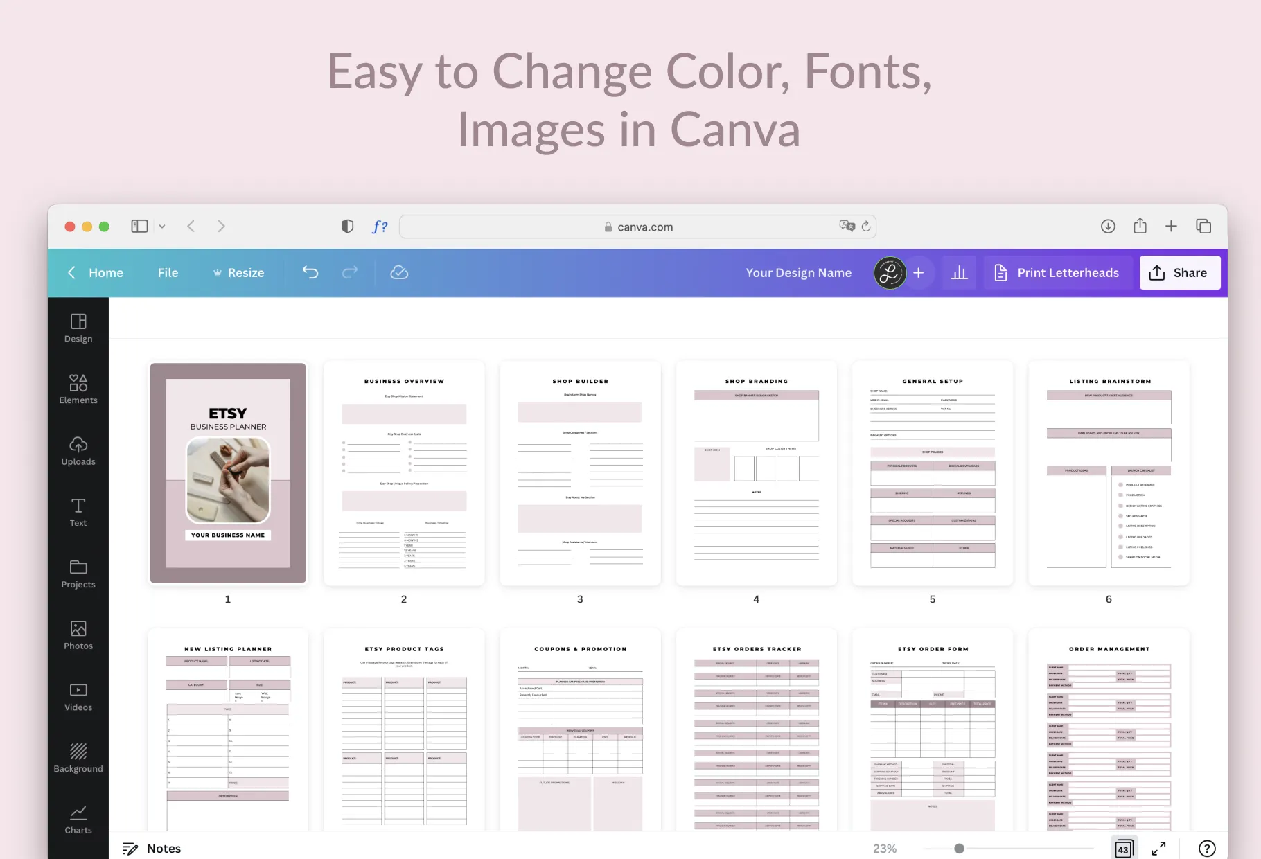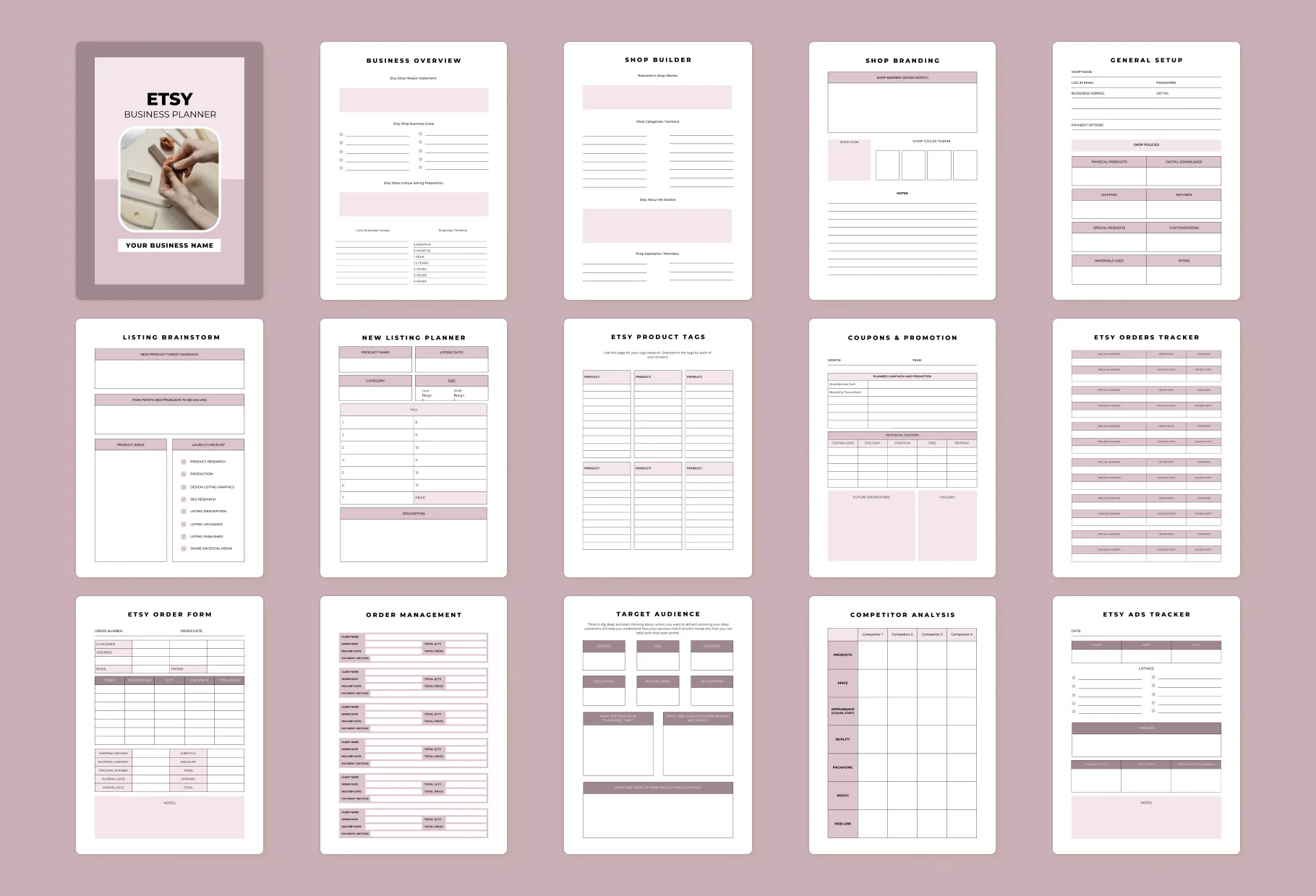 Are you an Etsy seller who wants to make your business a success? If so, my Etsy Shop Planner Canva Template is exactly what you need! This comprehensive planner will help you stay on top of the back-end administration of your shop and make your job easier. More than that, it contains pages to track your performance to help you grow your shop further. You’ll be able to set up order forms, product tags, and track ads – plus so much more! And because it’s made with Canva, you can customize it to fit whatever needs you have and even repurpose it for every new product launch. What better way to keep organized as an Etsy seller? With this handy planner, managing your business won’t feel like such a struggle anymore. It’s just what any digital entrepreneur needs! Business Overview Shop Builder Shop Branding General Setup Listing Brainstorm New Listing Planner Etsy Product Tags Coupons & Promotion Etsy Orders Tracker Etsy Order Form Order Management Target Audience Competitive Analysis Etsy Ads Tracker Quarterly Goals Product Updates Annual Profit Order Tracker Seasonal Planner Daily Planner Weekly Planner Yearly Planner Monthly Calendar Notes Etsy Pinterest Planner Keyword Research Etsy Growth Tracker Quarterly Stats Quarterly Goals Monthly Stats Expense & Fees Return Tracker Shipping Log Purchase Tracker Supplies Tracker