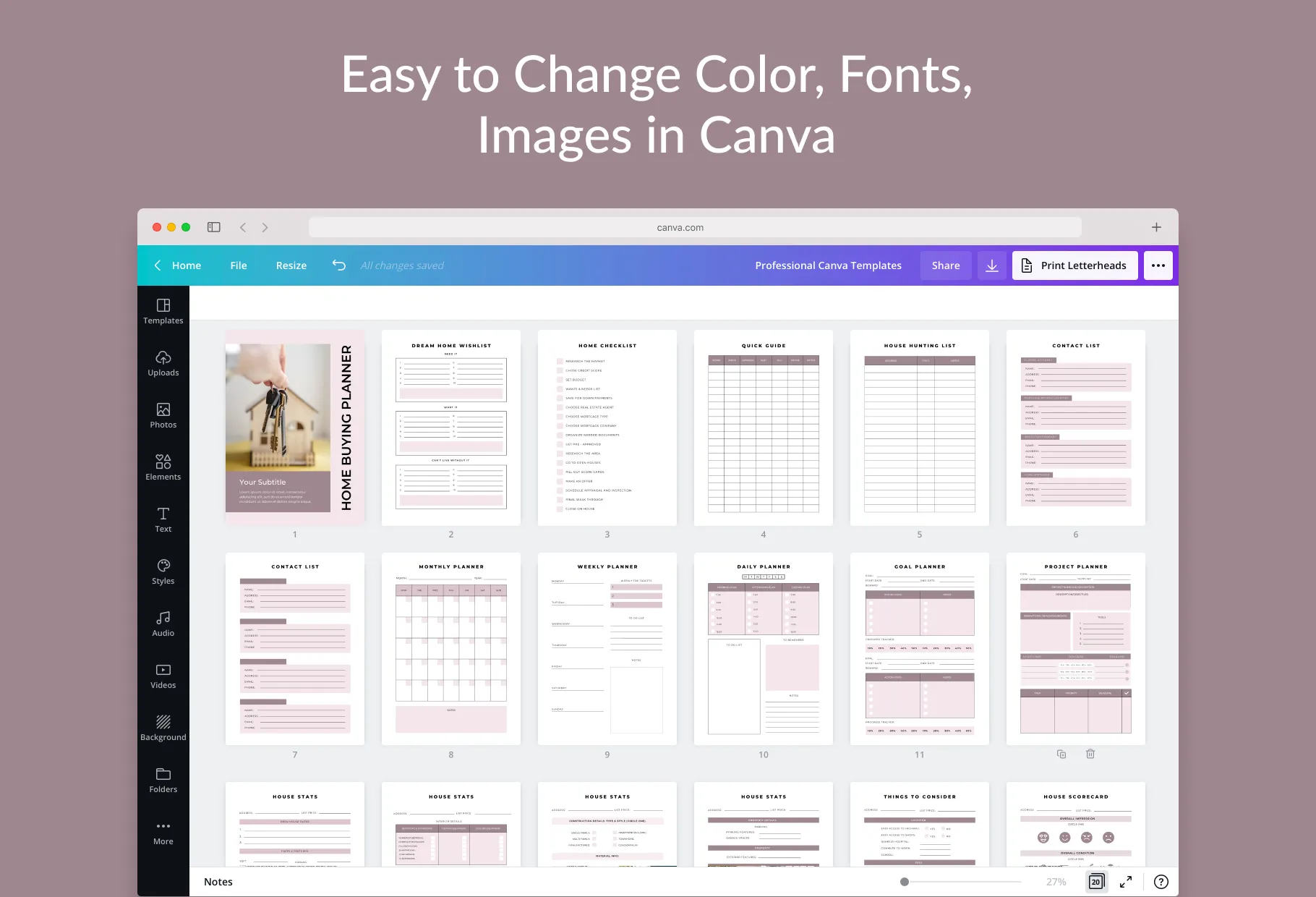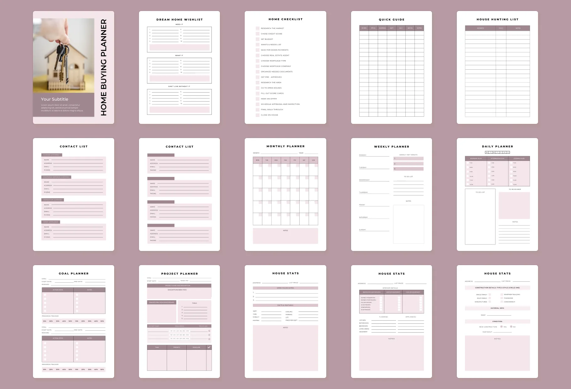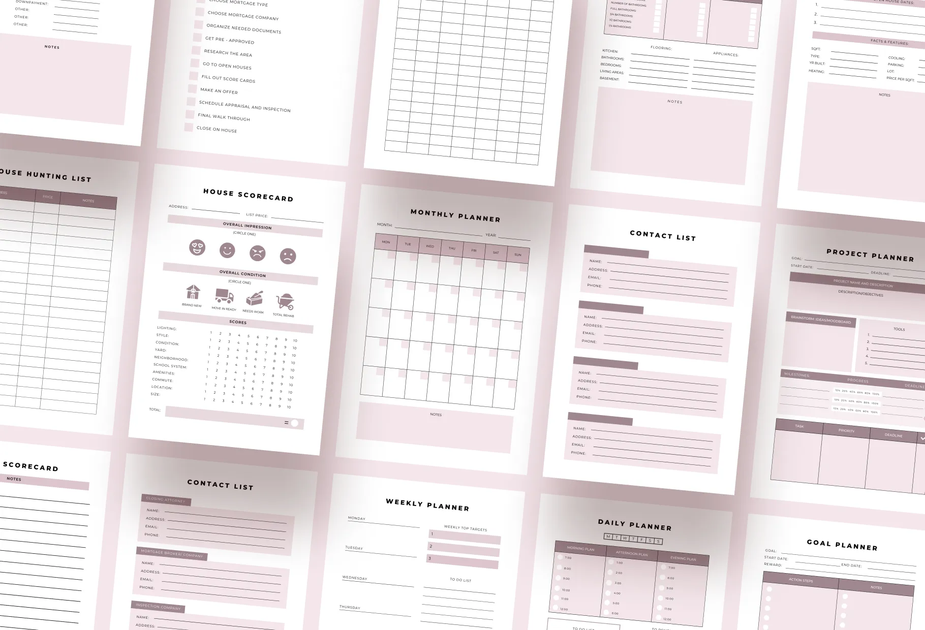 Buying a new home is an exciting experience that usually requires careful thought and planning. And if you’re in real estate, helping clients with the house buying process, it’s even more critical to confidently make the right decisions. That’s why I created this planner for you. It gives you and your clients all the tools you need to make informed decisions when selecting a home. The planner includes pages to evaluate houses, list needs for a new home, make renovation plans, checklists, and daily/weekly/monthly planners. Plus, it’s easy to customize on Canva for tailored results that meet your individual client needs. With this planner you can be sure that you clients will be making their best decision when it comes to buying a home. Dream Home Wishlist Home Checklist Quick Guide House Hunting List Contact List Project Planner Goal Planner Daily Planner Weekly Planner Monthly Planner Contact List House Stats Things to Consider House Scorecard Evaluation Sheet Worksheet Walkthrough Checklist Renovation Plans Moving Day Planning Moving Box Inventory Decision Maker