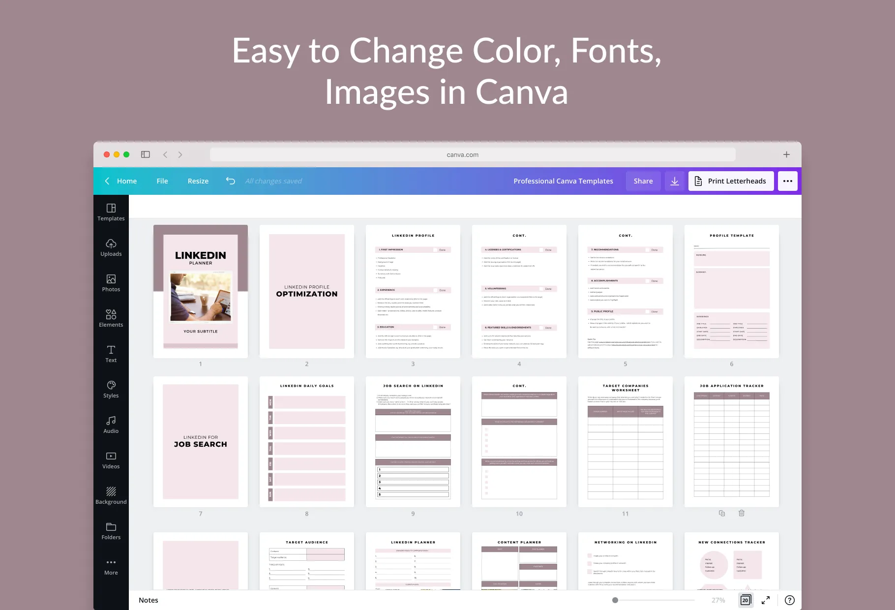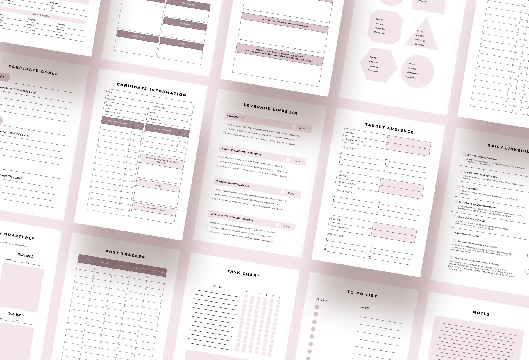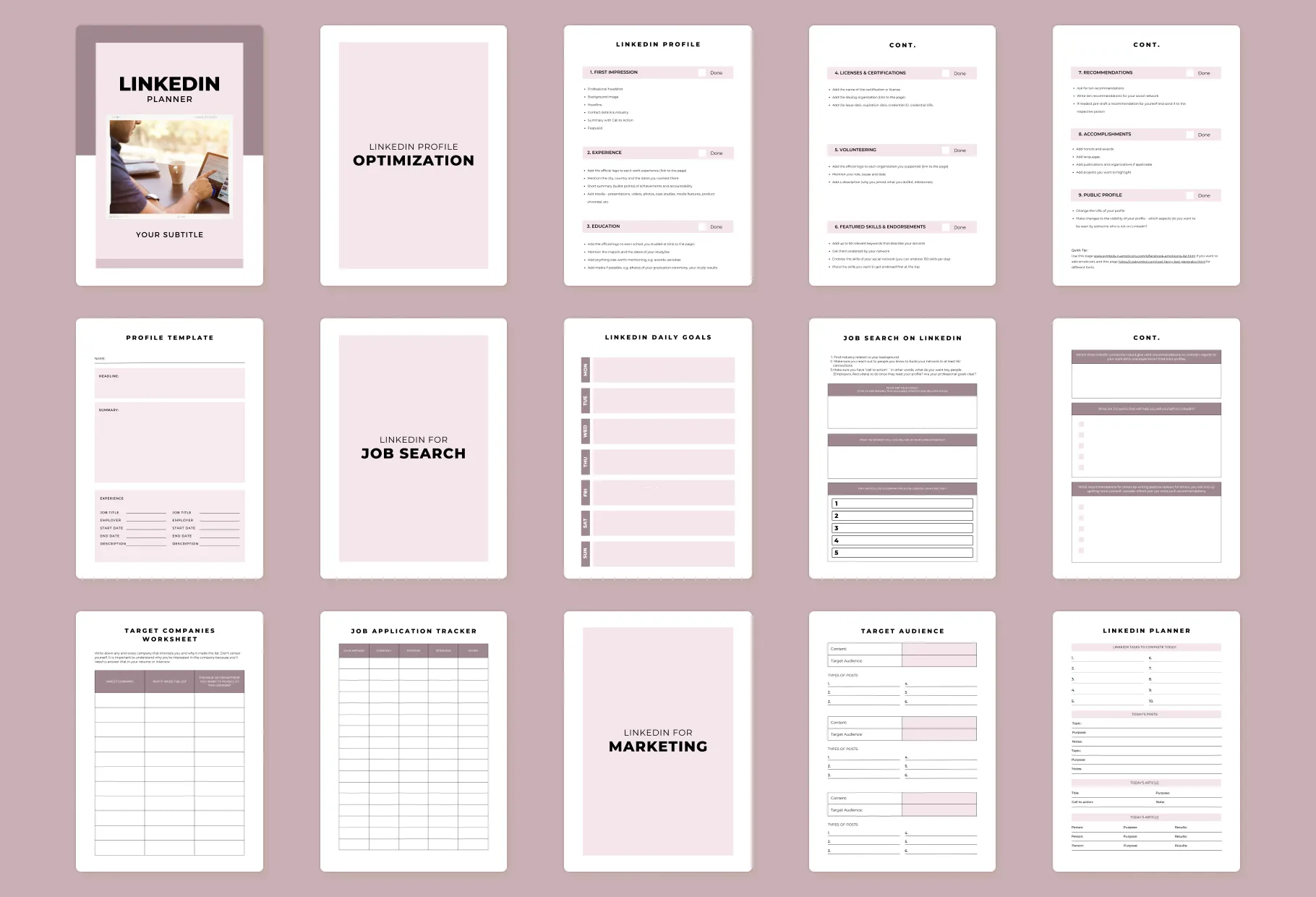 Looking for the ultimate tool to level up your Linkedin game? You’re in the right place because my Linkedin Planner Canva Template has got your covered on all bases. Whether you use Linkedin for recruitment, marketing, or finding jobs, this planner was made with YOU in mind and will make all of your work easier. More than just a planner, I designed this to guide and inspire, organize, strategize and streamline your work process from A-Z. I packed it full of worksheets, prompts, task lists, information sheets, checklists, trackers and so much ore – so you can optimize your profile for any kind of need. Plus, because it’s made with Canva, you can easily customize it with your branding and edit it however you want. This is the only tool that can take your performance up to the next level in no time! Linkedin Profile Optimization Linkedin Profile Profile Template Linkedin For Job Search Linkedin Daily Goals Job Search On Linkedin Target Companies Worksheet Job Application Tracker Linkedin For Marketing Target Audience Linkedin Planner Content planner Networking On Linkedin New Connections Tracker Linkedin Groups Leverage Linkedin Daily Linkedin Linkedin For Recruitement Candidate Information Candidate Goals Linkedin Quarterly Post Tracker Task Chart To-Do List Notes