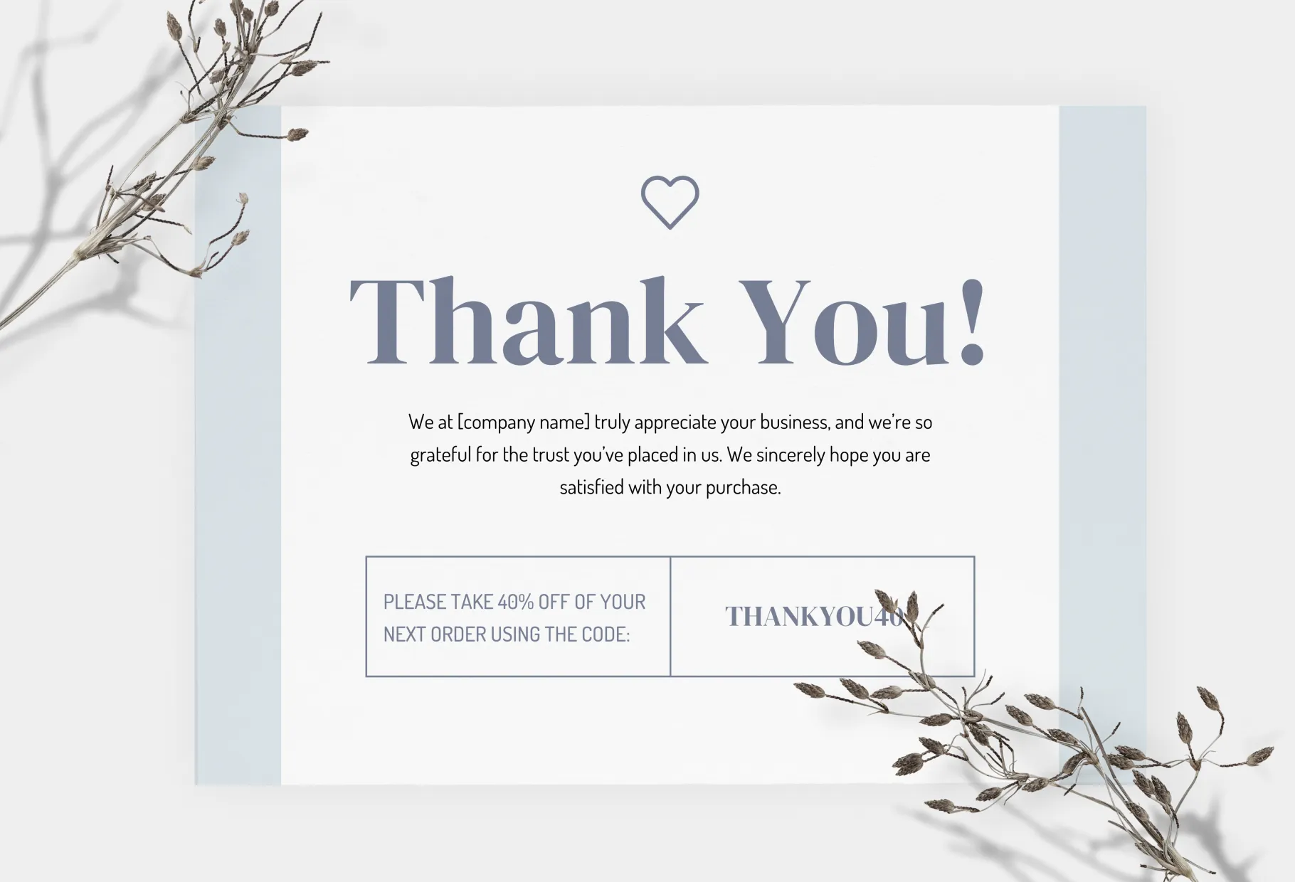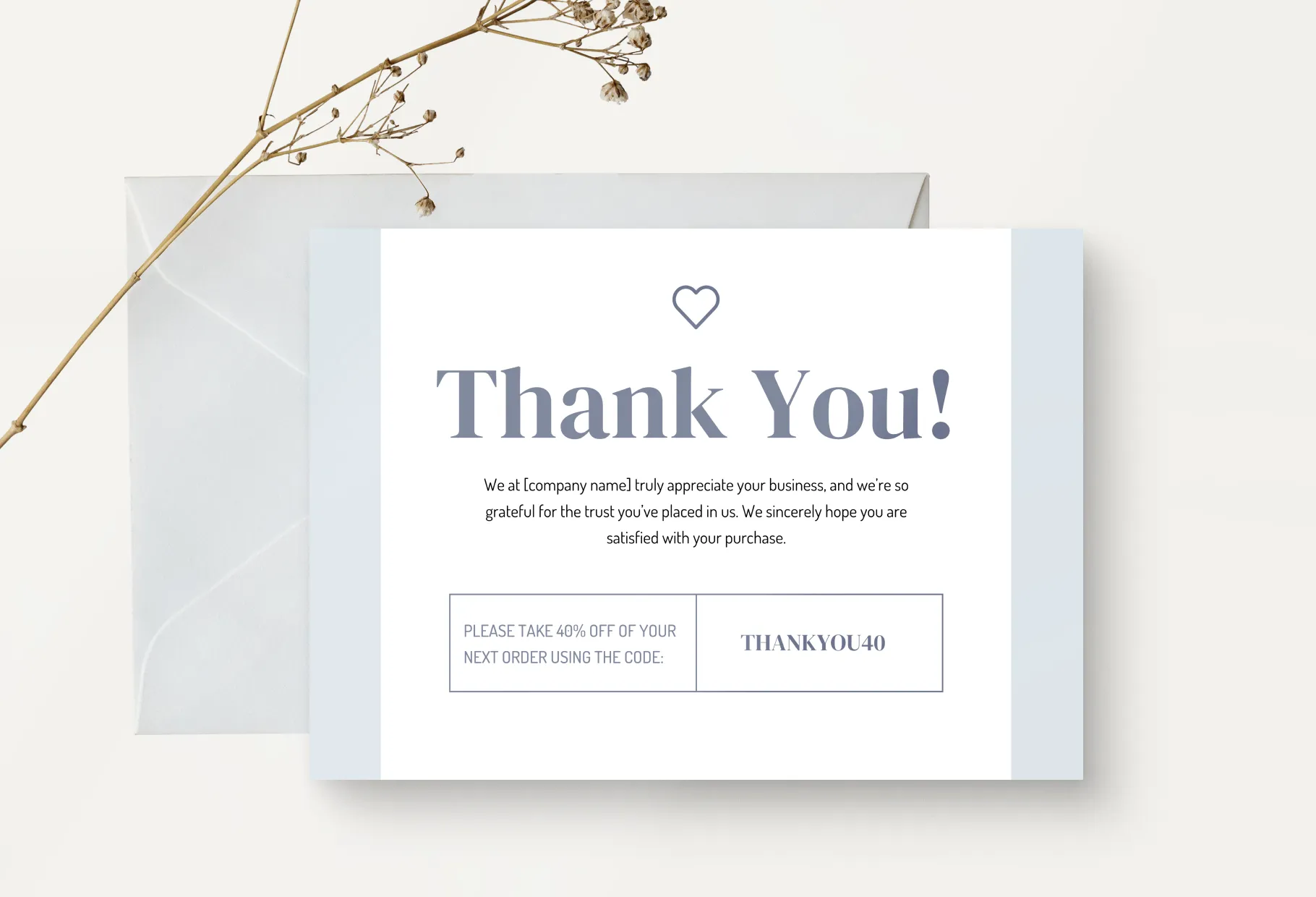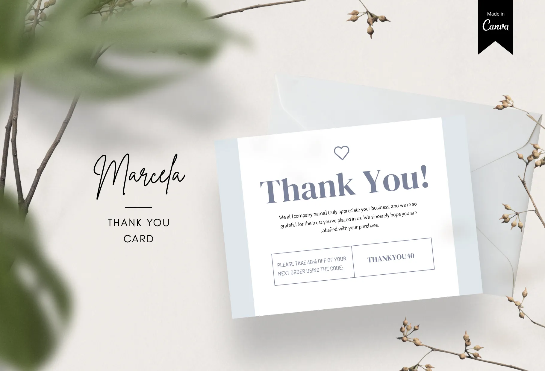 Thank You Cards are the best way to keep your customers coming back for more! Most sellers are too busy running their businesses to take time out for sending thank-you cards after every sale. A small gesture like sending a thank you card can make all the difference in how your customer feels about their purchase, and if they'll return again! This is especially important when selling online or on marketplaces where it's harder to build trust and rapport with buyers. Inserting a Thank you Card is a great way to show that you care about them and their experience with your business. But, designing the perfect card can be hard! This printable template will save you hours of time – just download the template file, import it to your free Canva account, fill in the blanks, add your logo, customize colors, fonts, or text styles without hiring someone else to do it for you! - It's super easy even if you don't have graphic design skills! Encourage repeat sales with this professional-looking thank you card for CANVA. This listing is for the digital files only*** No physical product will be sent.
