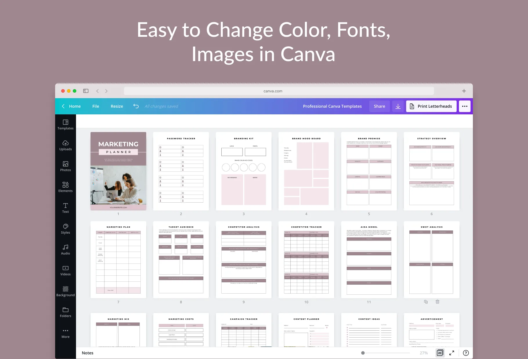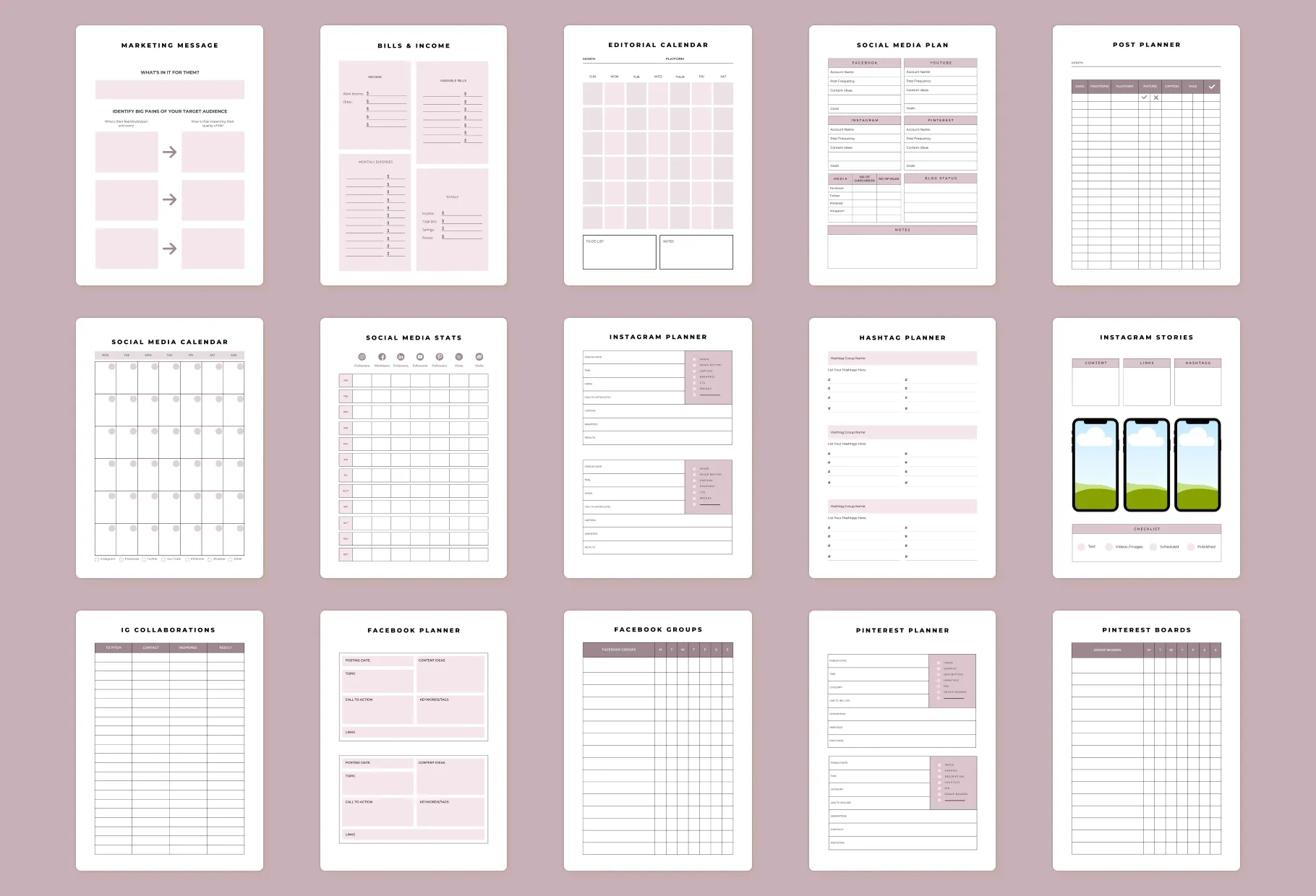 Stuck with Your Marketing Plans? I’ve Got You Covered! I remember the days when my desk was cluttered with a mix of scribbled notes, printed spreadsheets, and half-remembered ideas. It was a mess trying to keep up with marketing campaigns, affiliate partnerships, and everything in between. That’s why I created this all-in-one Marketing Planner Canva Template. Think of it as the helping hand to guide you through your marketing maze. Let's face it. Marketing can be overwhelming. From brainstorming content ideas to tracking campaigns, there’s a ton to keep up with. And a stray post-it note or forgotten password? That can be the small misstep that throws off an entire campaign. We've all been there—wasting hours sifting through old emails for passwords, trying to remember that genius content idea we had last week, or flipping through pages of notes to find our competitor's details. It's not just frustrating, it's inefficient. My Marketing Planner Canva Template is the remedy for that chaos. With dedicated pages for everything from your Branding Kit and Strategy Overview to Advertisement and Giveaway Planners, this template will become your marketing bible. Here’s who can benefit from this template: Small business owners looking to streamline their marketing efforts. Marketing professionals in need of a consolidated planning tool. Bloggers aiming to monetize and expand their reach. Brands hoping to keep track of their competitors and audience. Freelancers juggling multiple client projects. Startups looking for a clear way to align their marketing goals. Ready to level up your marketing game? Download my template today and embark on a journey of organized, efficient, and effective marketing strategies. Password Tracker Branding Kit Brand Mood Board Brand Promise Strategy Overview Marketing Planner Target Audience Competitor Analysis Competitor Tracker AIDA Model Swot Analysis Marketing Mix Marketing Costs Campaign Tracker Content Planner Content Ideas Advertisement Advertising Tracker Affiliates Sponsorships and Collabs Giveaway Planner Seasonal Promotion Quarterly Goals Campaign Budget