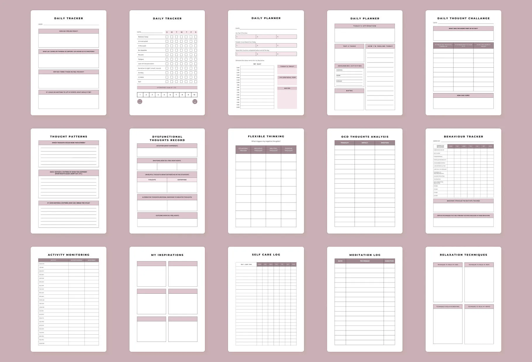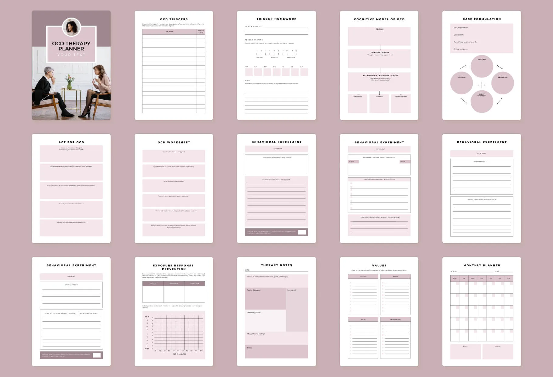 If you’re a therapist who specializes in OCD therapy, I made this planner specifically with you in mind. With a heavy focus on helping your clients identify their thoughts, triggers and behaviors, this planner helps them take actionable steps to live better lives. It’s packed with worksheets, trackers, technique sheets, planners and other documents to maximize results and help build better habits along the way. Plus, since I created it using Canva, you can easily customize it to fit the personal needs of your clients and your business - allowing for a tailored approach to OCD therapy that will have lasting impacts. OCD Triggers Trigger Homework Cognitive Model of OCD Case Formulation Behavioral Experiment OCD Worksheet Act for ocd Exposure Response Prevention Therapy Notes Values Monthly Planner Daily Planner Daily Tracker Daily Thought Challenge Behavior Tracker OCD Thoughts Analaysis Flexible Thinking Self Care Log Medication Log Relaxation Technique Dysfunctional Thoughts Record Thought Patterns Activity Monitoring My Inspirations Mood Chart Habit Tracker Gratitude Journal Bucket list Meditation Tracker Therapy Visits Notes