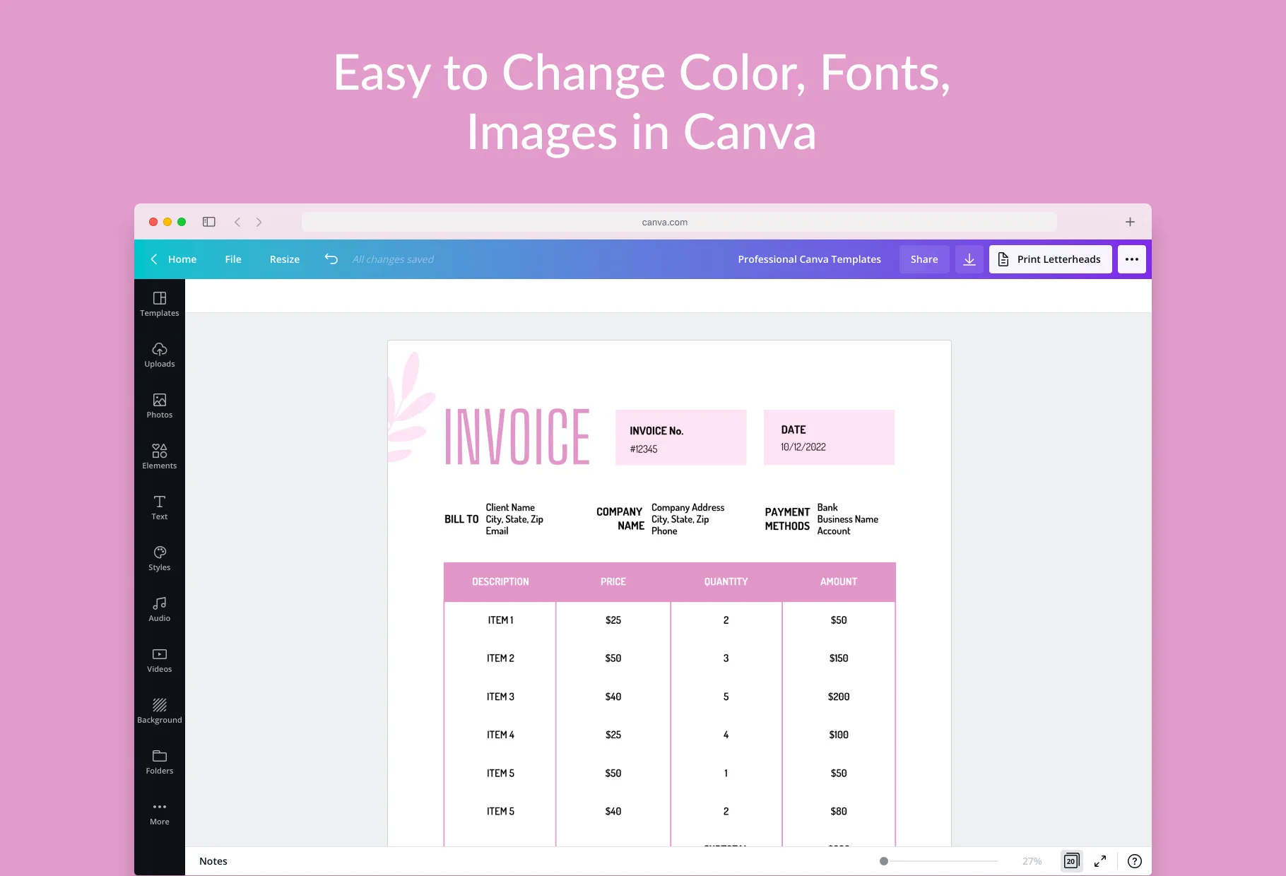 Invoices are an essential part of running a business, but they don't have to be boring. With this Invoice Canva template you can create your own custom invoices that are both professional and eye-catching. With just a few clicks, you can add your logo, contact information, and even a personal message. Plus, it's fully compatible with Canva's easy-to-use design tools, so you can easily make any further changes or adjustments that you need. So why not download this Printable and Editable Invoice Template for CANVA now and start making a great impression with your clients today?