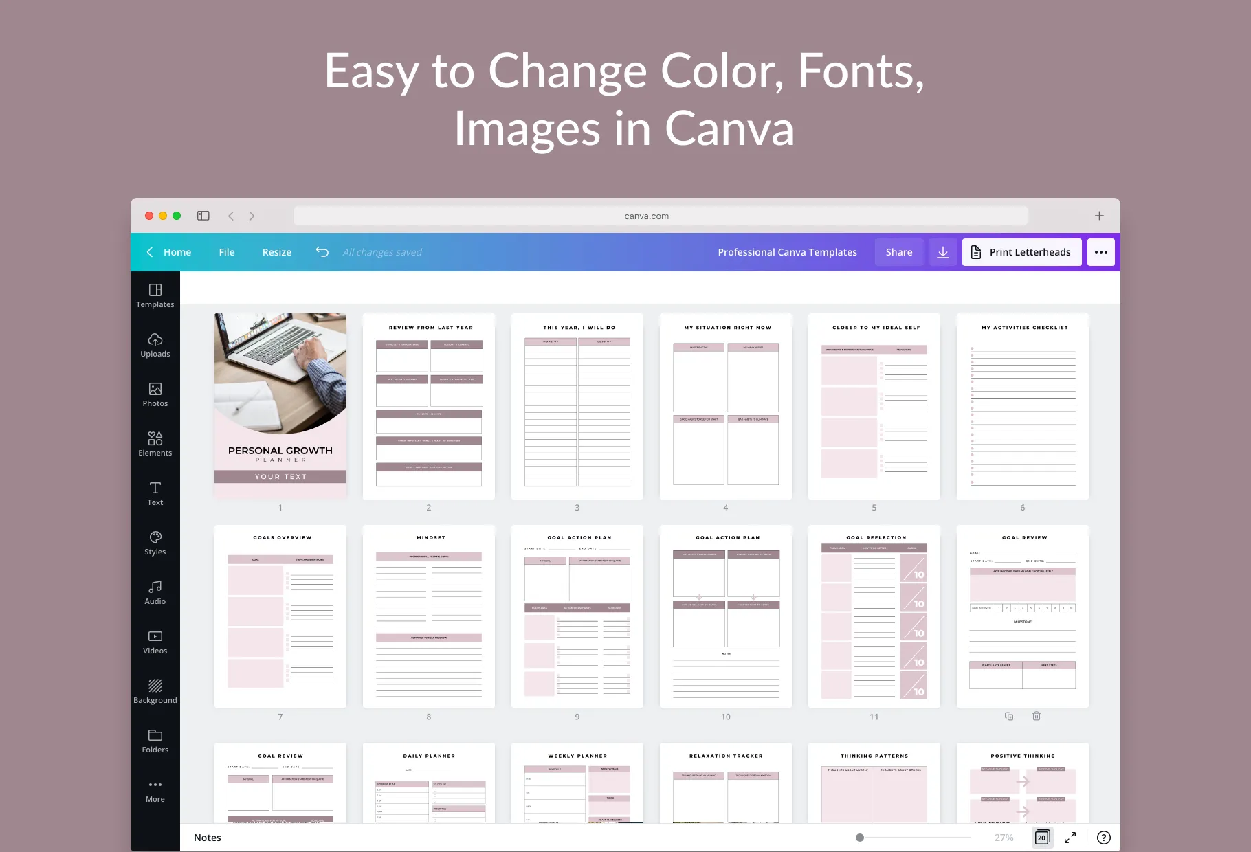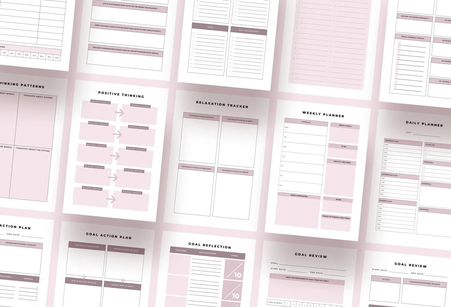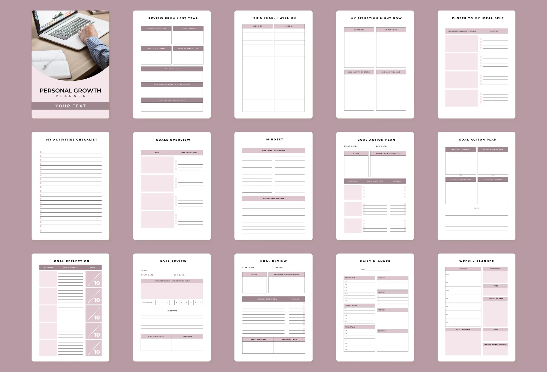 If you’re looking for a way to take your coaching, motivational speaking, conseling, or personal growth journey to the next level, then this planner is exactly what you’re looking for. I designed this with personal growth in mind so that you can help yourself and others set lifelong habits and actionable plans towards their goals. This planner also provides guides for positive thinking and progress tracking on a daily, weekly, monthly basis so that you can stay on top of your plans. Best of all, it’s created with Canva to allow for ultimate customization to match any needs and branding. Review from Last Year This Year, I Will Do My Situation Right Now Closer to My Ideal Self Goal Action Plan Mindset Goals Overview My Activities Checklist Goal Reflection Goal Review Daily Planner Weekly Planner My Soul Stuff Going With The Flow Positive Thinking Thinking Patter My Meditation My Resources
