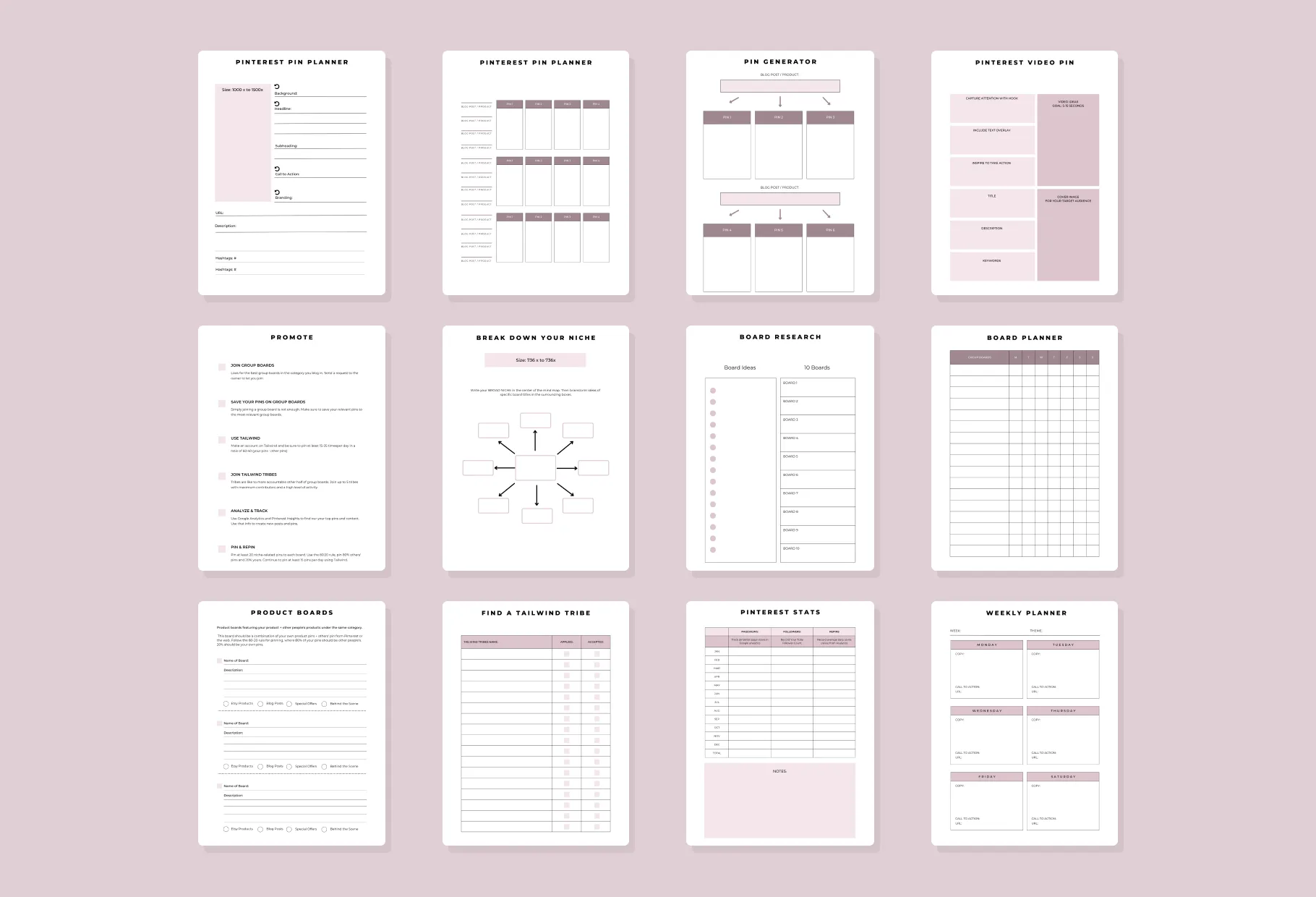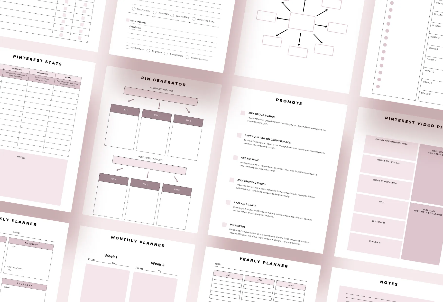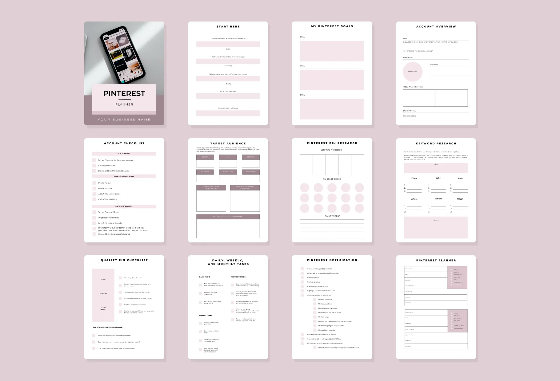 Are you overwhelmed with Pinterest marketing and struggling from less than stellar results? Or are you an expert looking for some guidance and additional assets? You’re in the right place because my Pinterest Planner Canva Template is out of this world and is here to help! This all-in-one tool is perfect for small business owners, brands, influencers, and anyone else looking to target their ideal customers online. It comes with pages and prompts designed to help you write down your goals, nail down your niche, conduct research, do optimization checklists and more. Every business needs a plan to be successful on Pinterest. This planner will act as your very own marketing expert of strategist, helping you get to the next level. Plus, since it’s created with Canva, it’s easily customized so that you can make it your own. With the ability to brand each page according of the type of business you’re running or sell it off as a product to offer your clients – you’ll have more control over your success on this platform that many marketers are still trying to conquer. Get ready to unlock greater success on Pinterest with this one-of-a-kind planner today! Start Here My Pinterest Goals Account Overview Account Checklist Target Audience Pinterest Pin Research Keyword Research Quality Pin Checklist Daily, Weekly, and Monthly Tasks Pinterest Optimization Pinterest Planner Pin Generator Pinterest Video Pin Promote Break Down Your Niche Board Research Board Planner Product Boards Find A Tailwind Tribe Pinterest Stats Weekly Planner Monthly Planner Yearly Planner