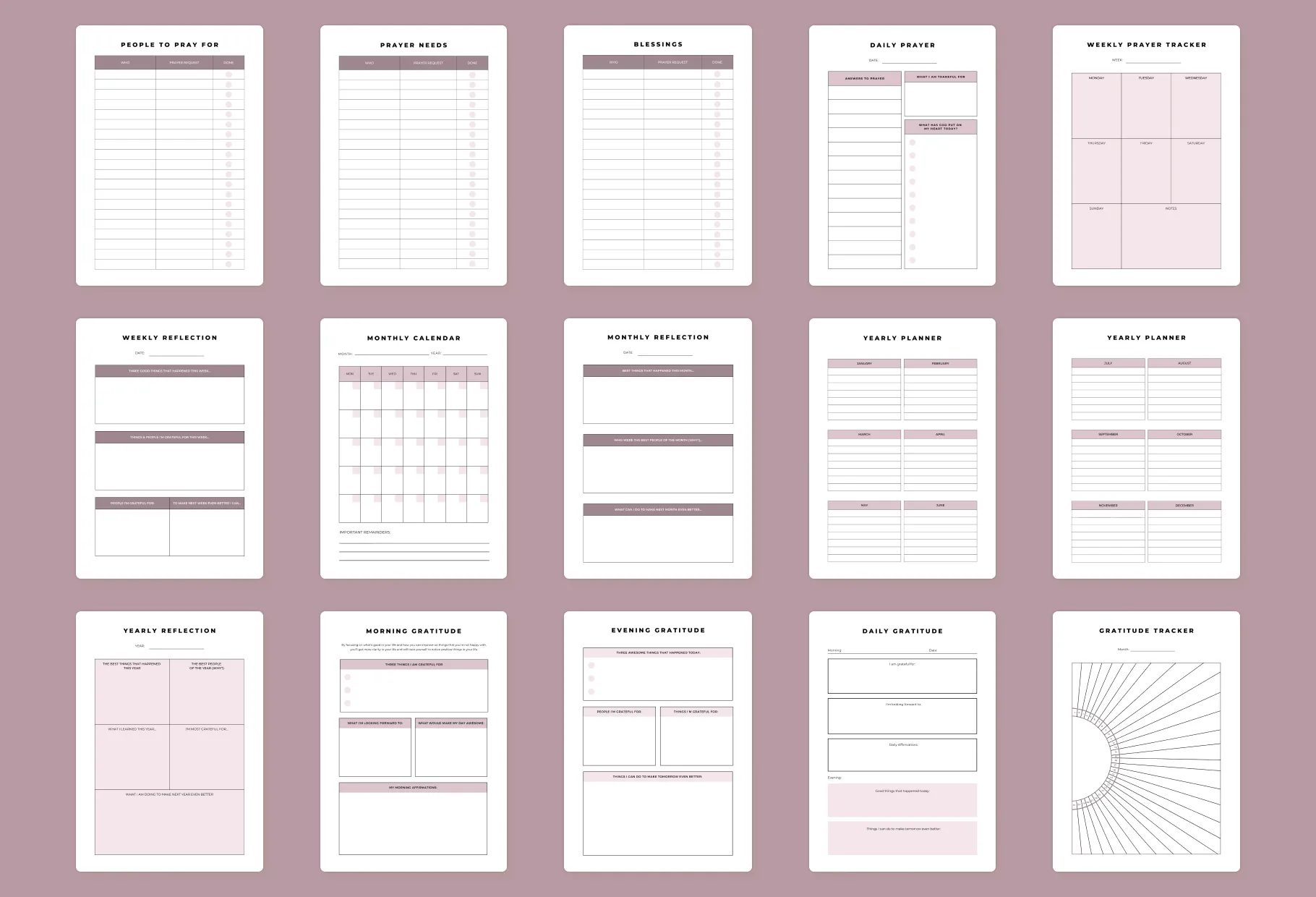 Are you looking for an easy and convenient way to organize your prayer circle, bible study group, or religious ministry? Look no furhter than this Prayer Journal Template. This template provides everything you need to help track and monitor your progress in a fun and organized way, helping you and others be more pro-active in their prayers. It’s jam-packed with pages to assist in listing down all those things and people that you need to pray for. Pages that encourage life reflections and gratitude tracking make it easier for you to stay on top of the various components involved in creating a comprehensive spiritual practice. It’s foolproof organization allows for even the business of members or followers to take part in creating a positive spiritual habit. With this journal template created using Canva, you have complete control over how it is customized to fit your needs. And with it’s simple yet modern design, shareable contents as well as creating layout options, you will be able to create custom content that reflects any image or idea desired with ease. Life Reflection My Prayer List Prayer Journal People To Pray For Prayer Needs Blessings Daily Prayer Weekly Prayer Tracker Weekly Reflection Monthly Calendar Monthly Reflection Yearly Planner Yearly Reflection Morning Gratitude Evening Gratitude Daily Gratitude Gratitude Tracker