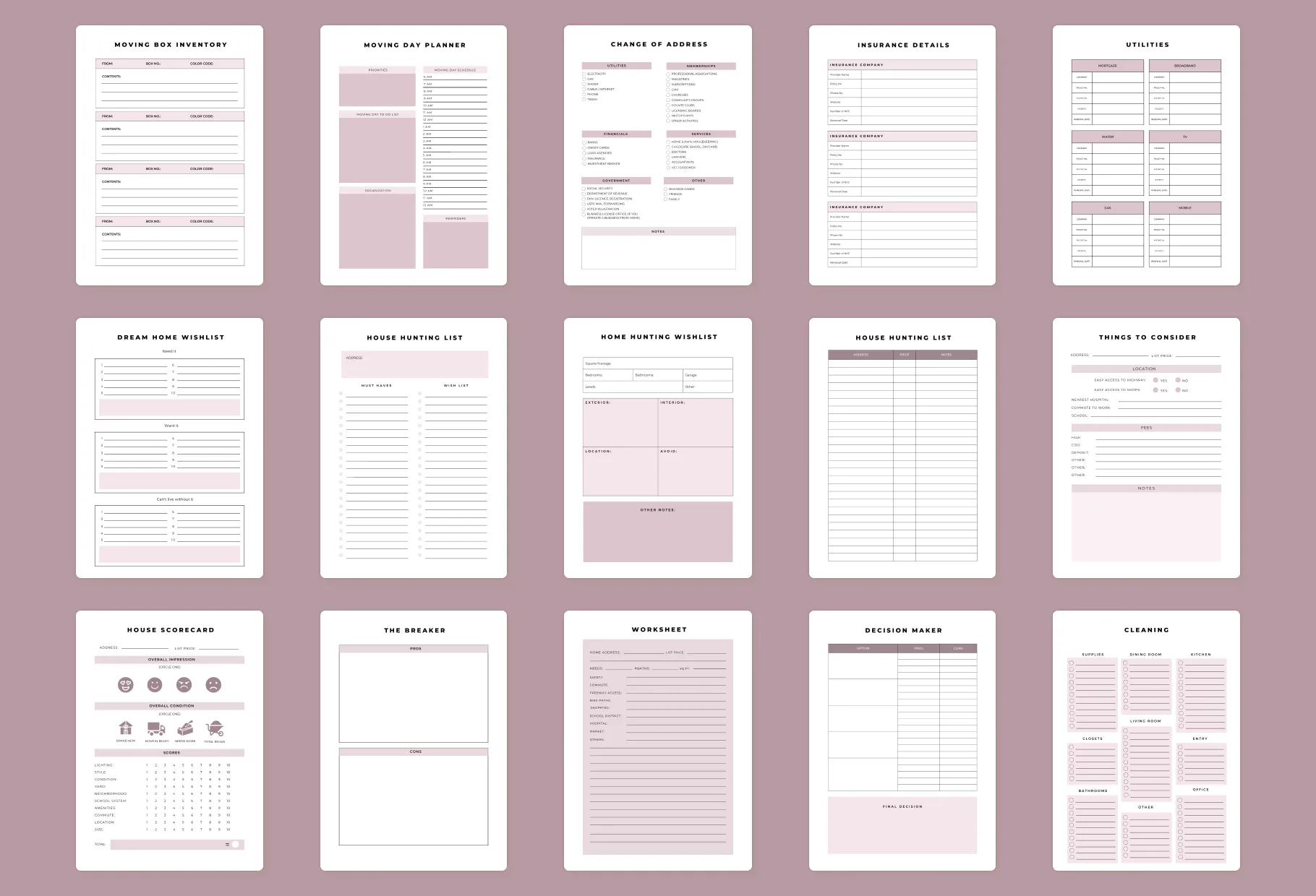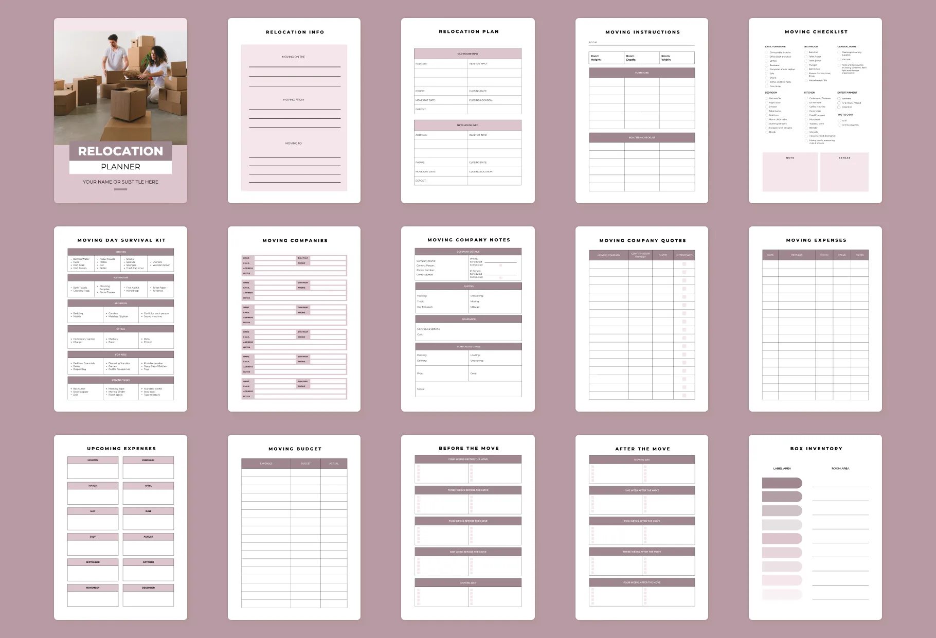 Relocating to a new home is a big undertaking. There's a lot to think about and plan for, from finding a new place to packing up all your belongings, and making sure you don't forget anything important. This Relocation Planner Canva template is designed to make the process as seamless and stress-free as possible. It’s perfect for real estate brokers, property managers, project managers, and even interior designers. It's packed with everything you need to consider when relocating, from house hunting and budget setting to finding moving companies and after-the-move plans. With this planner by your side, you can be confident that you're covering all your bases and that nothing will be left to chance. Make your next move the easy way with this comprehensive relocation template. Relocating Info Relocation Plan Moving Instructions Moving Checklist Moving Companies Moving Company Notes Moving Company Quotes Moving Expenses Upcoming Expenses Moving Budget Before The Move After The Move Box Inventory Moving Box Inventory Moving Day Planner Change of Address Dream Home Wishlist House Hungting List Home Hunting Wishlist Things to Consider House Scorecard The Breaker Worksheet Decision Maker Cleaning Speed Cleaning Room by Room Room Dimensions Design Planner Room Assessment Renovation Log DIY Project Paint Tracker Inventory Tracker Shopping List