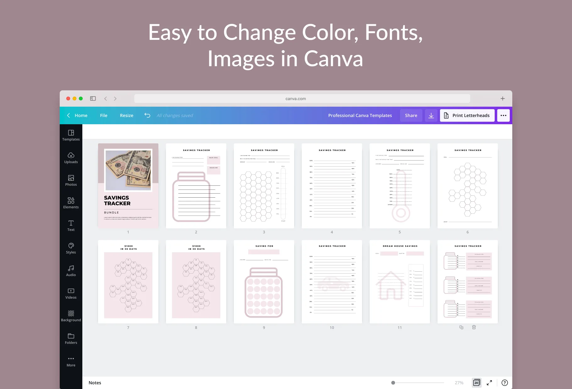I get it – keeping track of savings can be daunting. It's super easy to lose sight of your goals when you're scribbling numbers on random bits of paper or, worse, keeping everything jumbled up in your head. And let's be honest, traditional tracking methods can be boring, ineffective, and confusing. You might have tried different apps and notebooks, but you still end up abandoning them halfway because they don’t resonate with your style or don’t have what you need. That's exactly why I crafted my Savings Tracker Canva Template. It's a blend of functionality and aesthetics, designed to keep you motivated and organized. With dedicated pages like the Savings Tracker, Lists, Dream House Savings, Saving For, and others, you get a holistic view of where you're at and where you're headed. No more guesswork, just crystal clear clarity. Who can benefit from this template? Here's a quick list: Individuals kick-starting their savings journey. Couples planning for big future expenses. Parents saving for their children’s future. Students trying to budget their allowances or save up for something special. Anyone who needs a visual reminder and structured way to monitor their savings. So, why wait? Make your savings journey enjoyable, clear, and efficient. Download my Savings Tracker Canva Template now and let's pave the path to your dreams together!