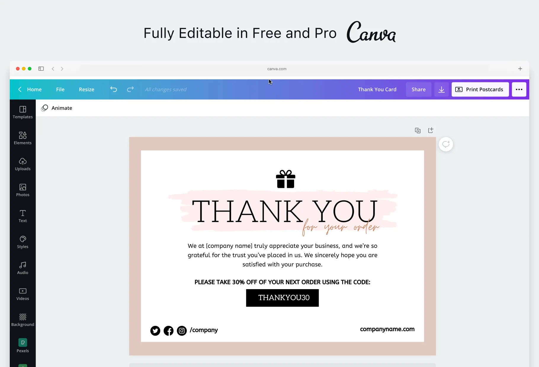 Thank You Cards are the best way to keep your customers coming back for more! Most sellers are too busy running their businesses to take time out for sending thank-you cards after every sale. A small gesture like sending a thank you card can make all the difference in how your customer feels about their purchase, and if they'll return again! This is especially important when selling online or on marketplaces where it's harder to build trust and rapport with buyers. Inserting a Thank you Card is a great way to show that you care about them and their experience with your business. But, designing the perfect card can be hard! This printable template will save you hours of time – just download the template file, import it to your free Canva account, fill in the blanks, add your logo, customize colors, fonts, or text styles without hiring someone else to do it for you! - It's super easy even if you don't have graphic design skills! Encourage repeat sales with this professional-looking thank you card for CANVA. This listing is for the digital files only*** No physical product will be sent.