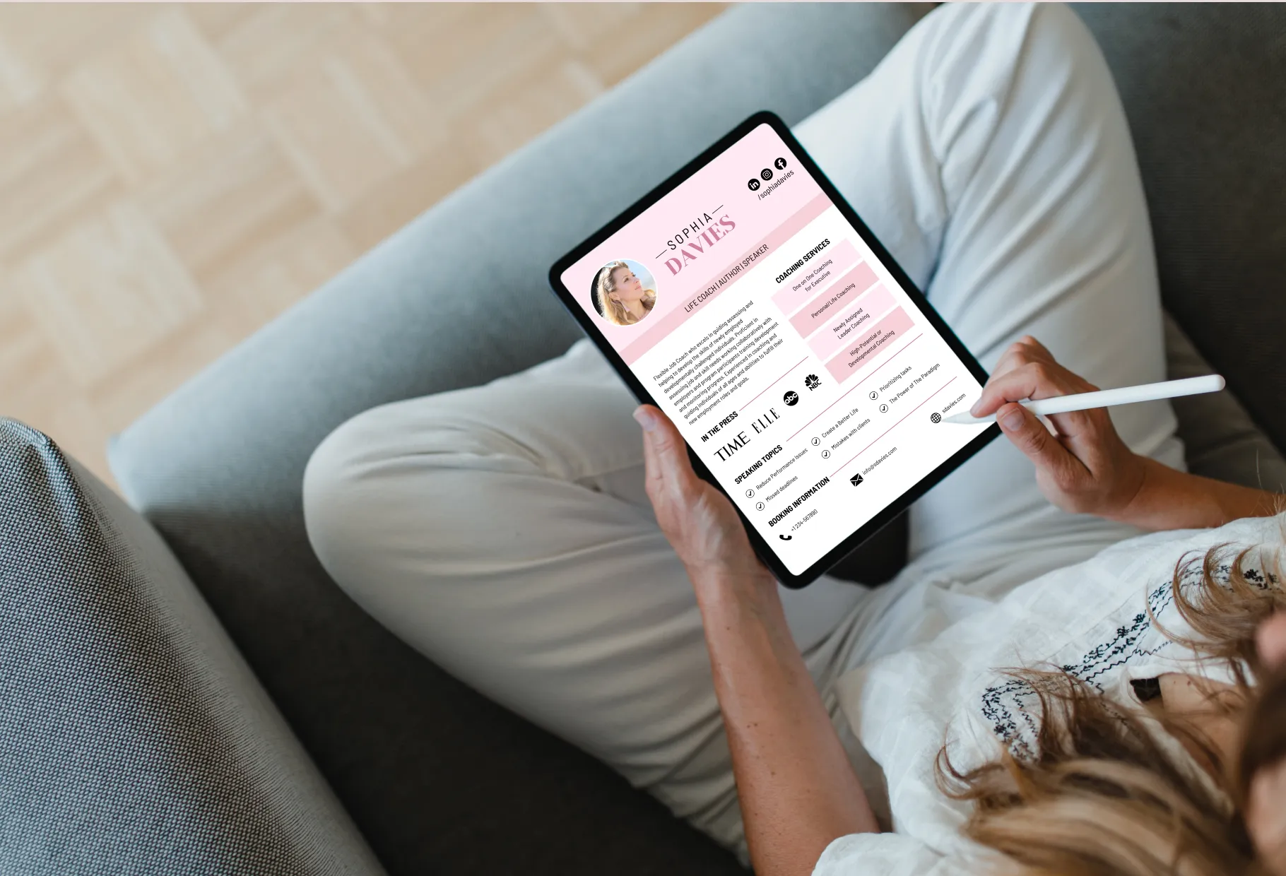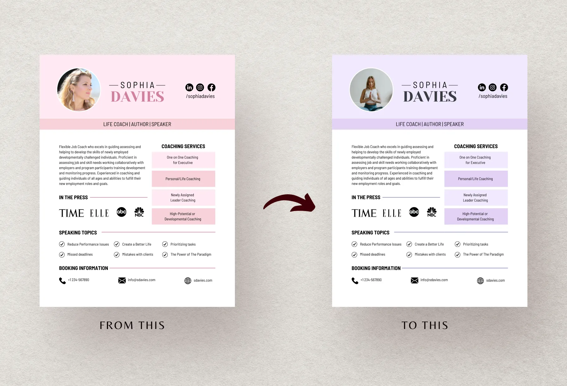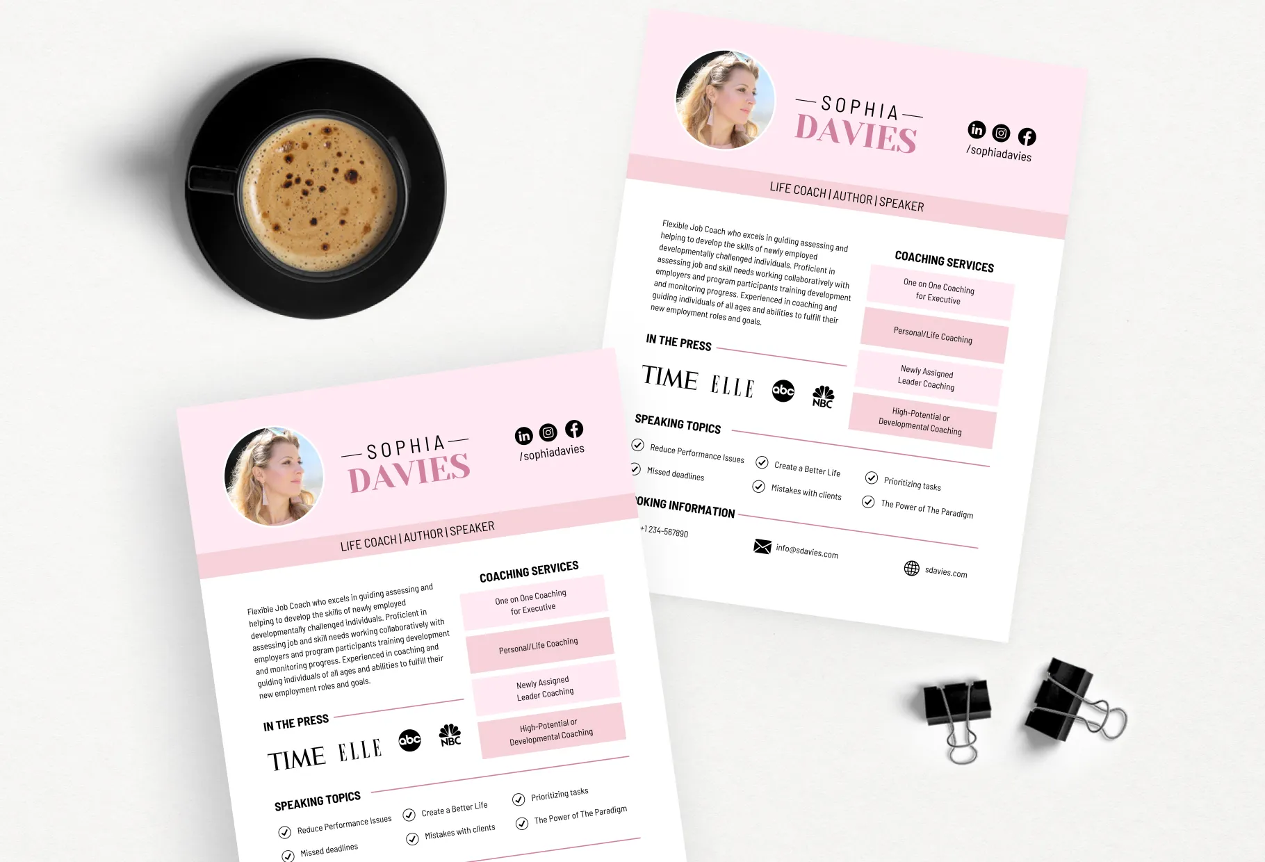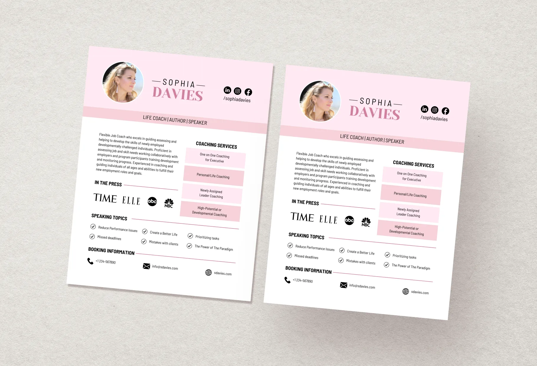 Market yourself better with this professional and easy-to-edit Canva template for speakers and personal brands. As a speaker, you should be marketing your expertise and communicating it to event planners. You need to collate all the information they need and present it at a glance. This speaker sheet canva template is an excellent way to highlight your experience and expertise, as well as your presentation topics and the value you deliver to event organizers and planners. Build and promote your personal brand with this professional-looking speaker one-sheet Canva template. Download Now.