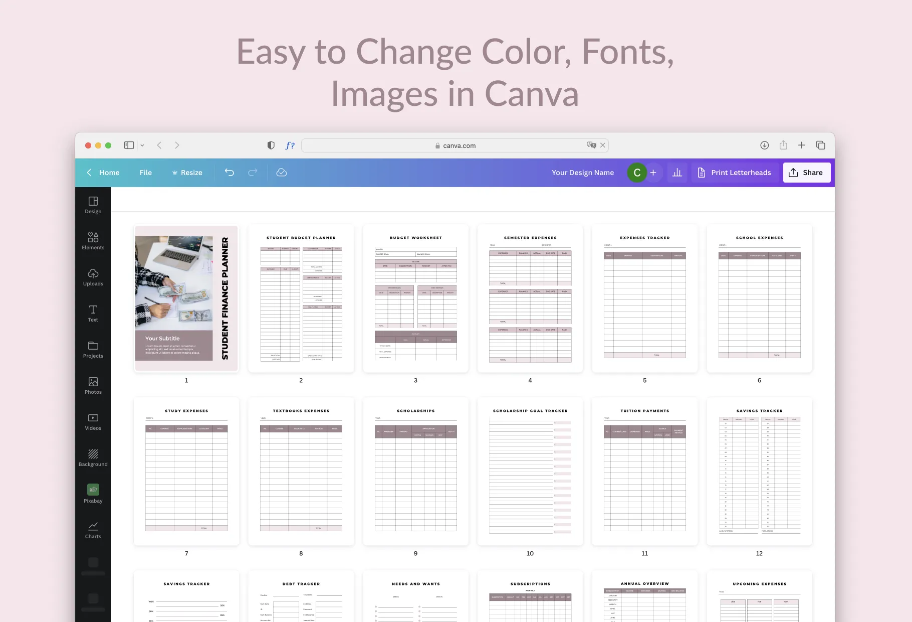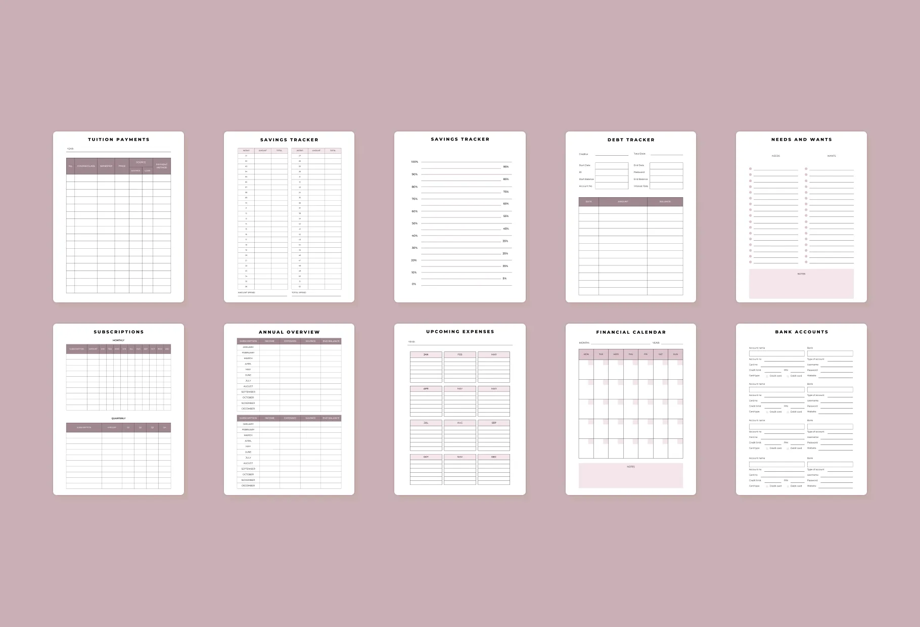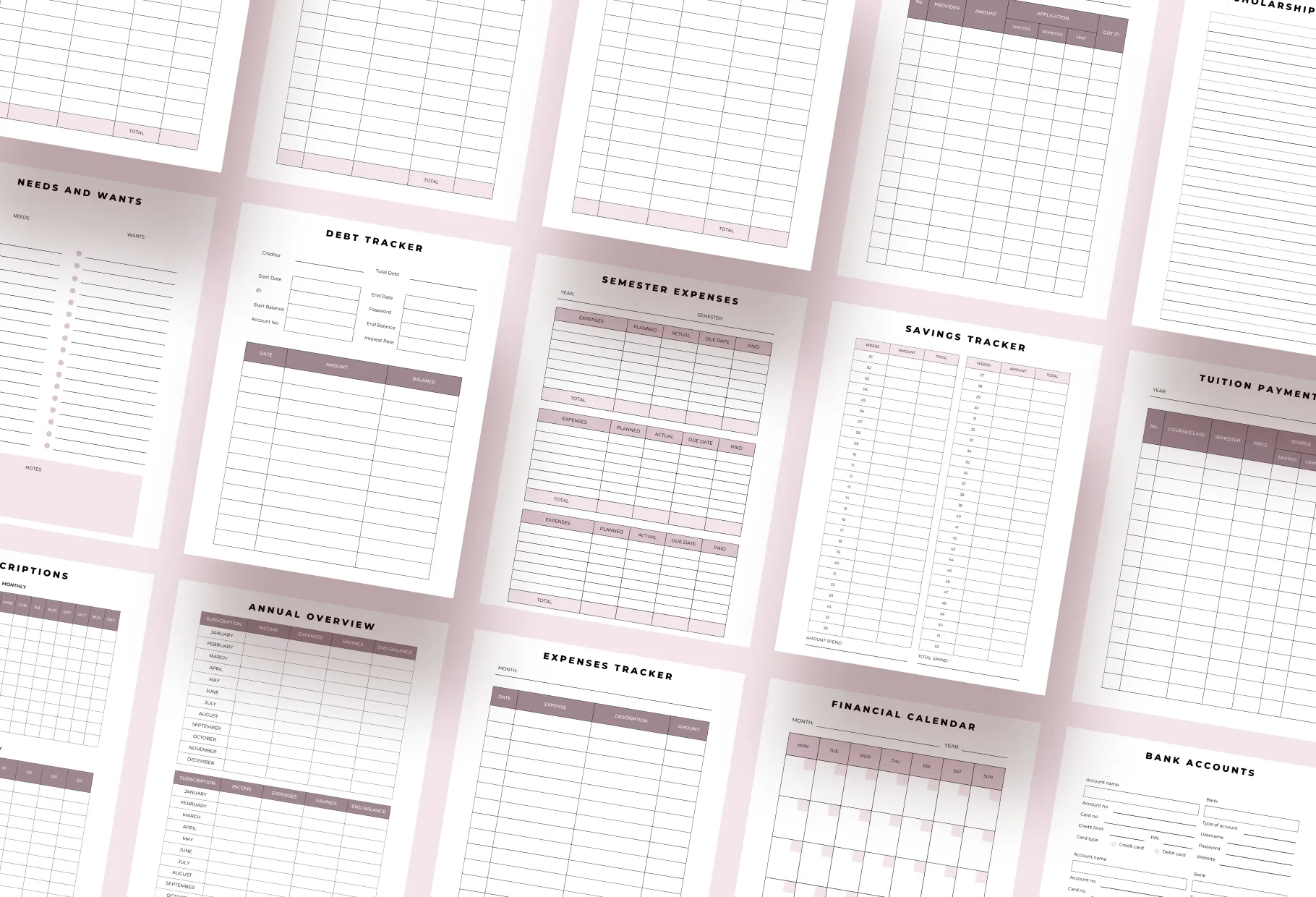 Are you an ambitious college student looking for an effective way to stay on top of your finances? If yes, I’ve created the best student finance planner for you! Designed to help students easily and accurately keep track of their budget and be aware of expenses, this planner also features pages to track scholarship applications and help you set goals. It’s the ultimate tool to teach yourself financial responsibility so you can be prepared for your future and not worry about the present. Plus, it’s all made in Canva so customizing, personalizing, and updating it is a breeze. With my student finance planner, keeping control of your finances has never been so easy. So give it a try and stop worrying about money management. Student Budget Planner Budget Worksheet Semester Expenses Expenses Tracker Scholarships Scholarship Goal Tracker Textbook Expenses Study Expenses School Expenses Tuition Payments Savings Tracker Subscriptions Annual Overview Upcoming Expenses Debt Tracker Needs and Wants Bank Accounts Financial Calendar