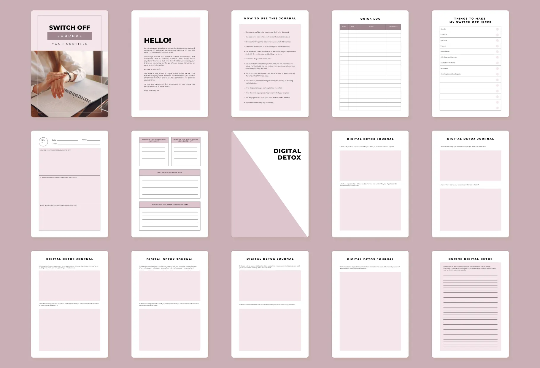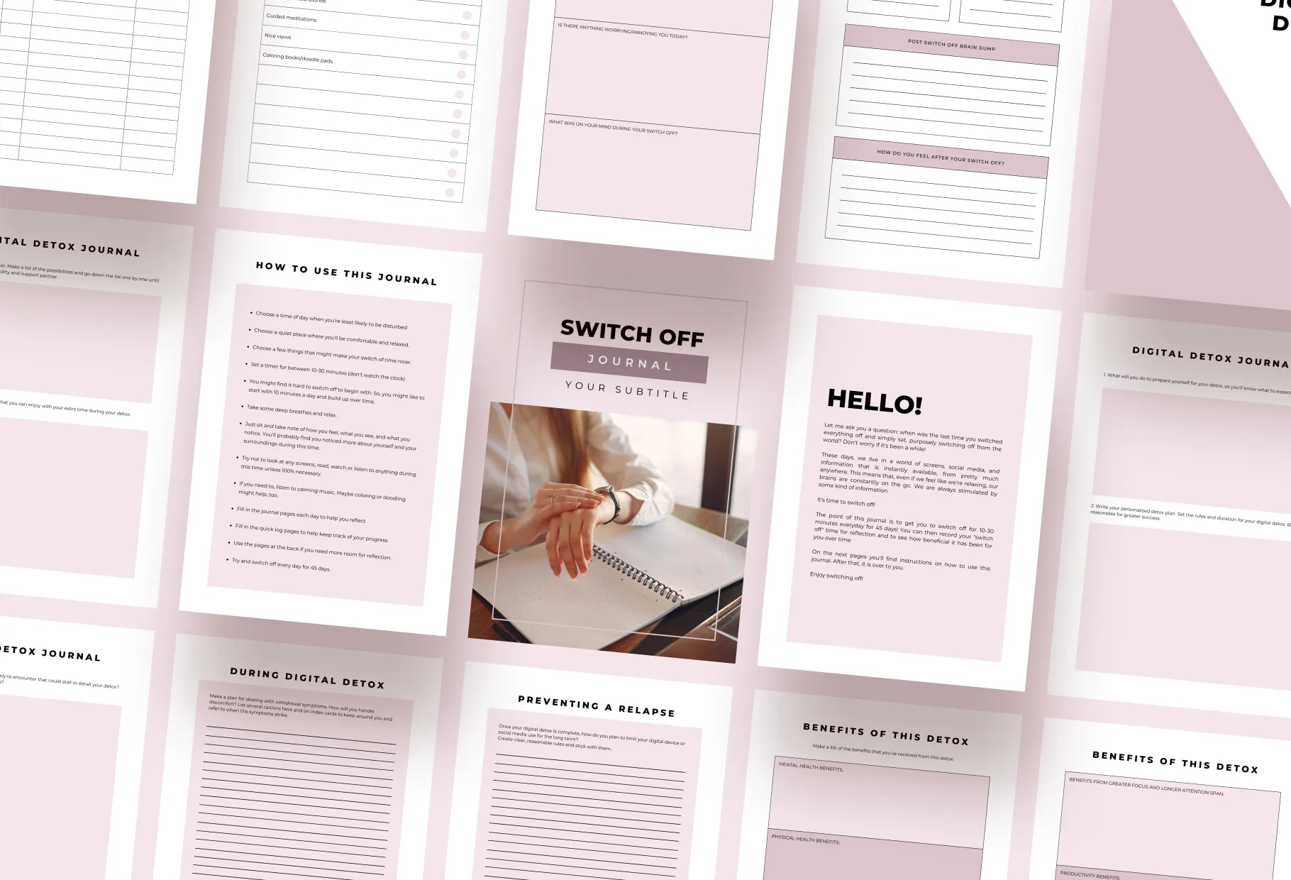 Do you ever feel like your work life has consumed all of your available time and energy? Are you looking for a healthy way to take a break from the digital world? If so, the Switch Off Journal Canva Template is perfect for you! With this product, you can easily set aside time for yourself to undertake restorative and mindful activities to promote self-care and be guided to organize your unload your thoughts. The Switch Off Journal Template was developed with you in mind, professionals in the digital marketing industry, who understand how difficult staying away from social media and other digital distractions can be. This journal includes pages that are designed to help you unwind, decompress, organize and process your thoughts in minute detail. It’s the ultimate tool for anyone who works heavily online or needs to take a break from demanding digital work – even if it's just 30-45 minutes a day. So if you’re ready to prioritize self-care and give yourself much-needed breaks from the online world, get this journal template. Your mind will thank you! Quick Log Things To Make My Switch Off Nicer Digital Detox Journal During Digital Detox Preventing A Relapse Benefits of This Detox