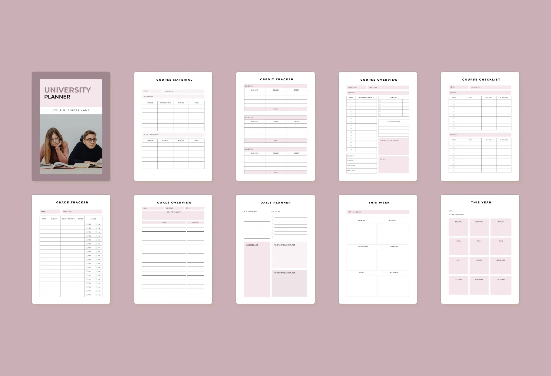 Managing your university life just got easier with my University Planner Canva Template. Designed with a deep understanding of the challenges students face, it's your go-to solution for staying organized and on top of your academic game. Keeping track of numerous courses, assignments, and exams can be overwhelming. Without a structured plan, it's easy to miss deadlines or underperform in your studies. Remember the stress of last-minute cramming and the chaos of misplaced notes? Those days of confusion and anxiety can take a toll on your academic performance and mental well-being. That's where my University Planner Canva Template comes in. It's meticulously crafted to cater to all your academic needs. From course overviews to detailed study plans, this template helps you streamline your university life. You'll find everything you need to stay organized and focused, including Course Material and Credit Tracker, Course Overview and Checklist, Grade Tracker and Goals Overview, and Daily, Weekly, and Yearly Planners. It also features Study Plans & Revision Worksheets, Exam Prep Tools like an Exam Prep Sheet and Examination Timeline, essential tools for mastering complex subjects such as Terminology, Translations, Formulas, Chapter Summary & Topic Study Methods, and Textbook List & Assignments Overview. This template is perfect for undergraduate and postgraduate students, part-time and full-time learners, international students needing help with organization and language barriers, and group project members seeking a unified planning tool. Say goodbye to disorganization and stress. Download my University Planner Canva Template today and take the first step towards a more structured, successful, and stress-free university experience! Course Material Credit Tracker Course Overview Course Checklist Grade Tracker Goals Overview Daily Planner This Week This Year Year At A Glance Weekly Schedule Weekly Study Plan Revision Worksheet Daily Study Planner Weekly Study Planner Study Plan Exam Prep Sheet Examination Timeline Terminology Translations Formulas Chapter Summary Topic Study Methods Topic Analyzer Textbook List Assignments Overview Assignment Worksheet Group Assignment Others
