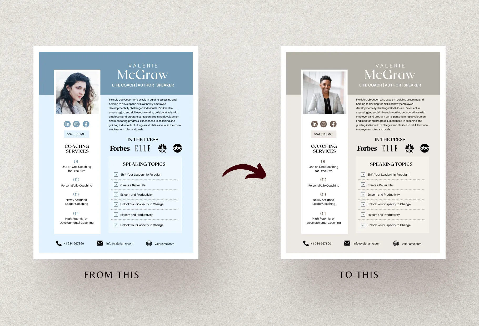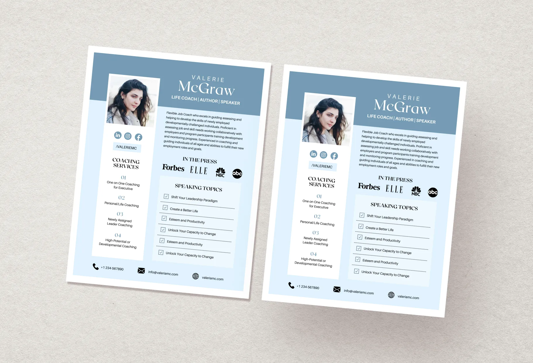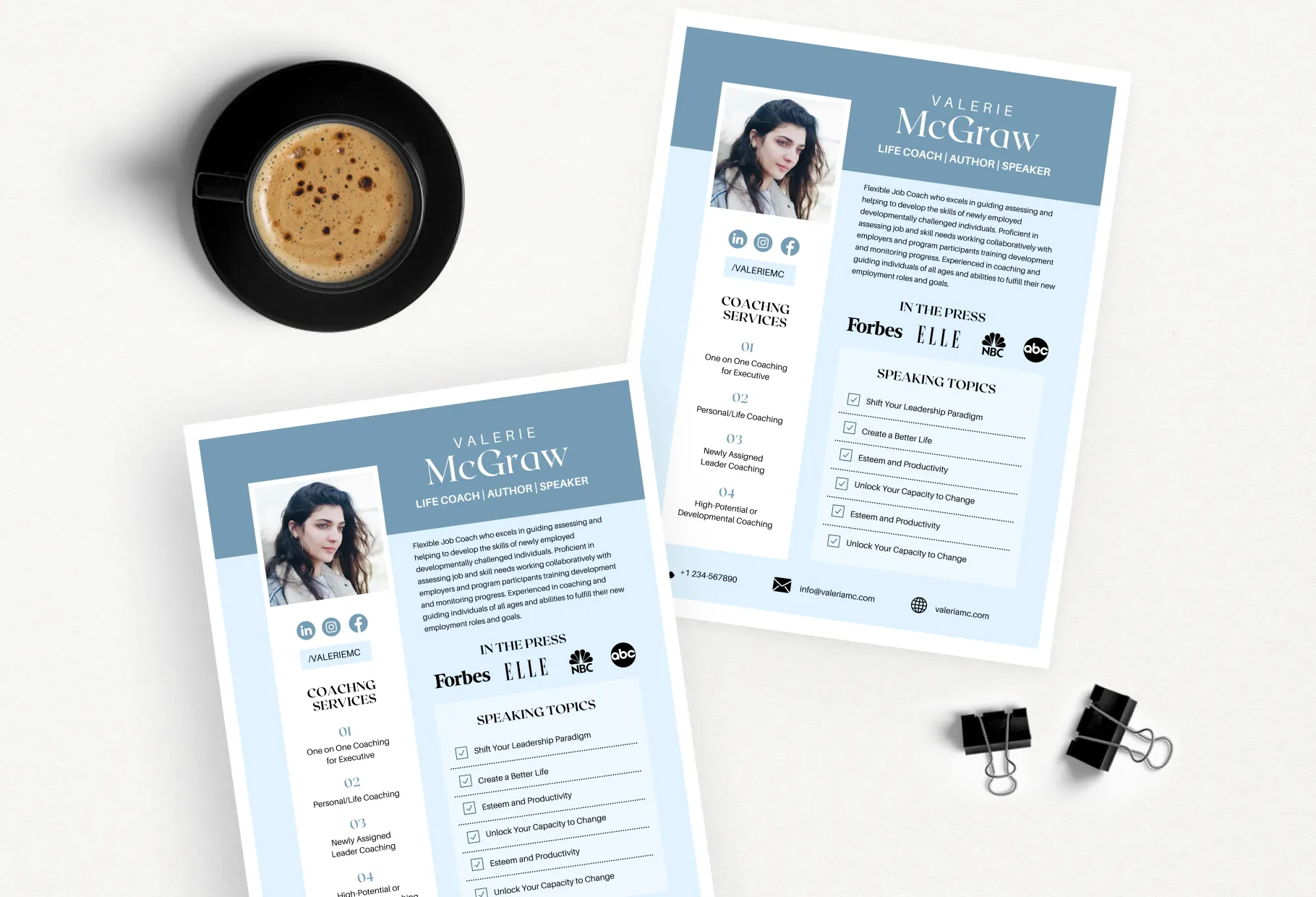 Market yourself better with this professional and easy-to-edit Canva template for speakers and personal brands. As a speaker, you should be marketing your expertise and communicating it to event planners. You need to collate all the information they need and present it at a glance. This speaker sheet canva template is an excellent way to highlight your experience and expertise, as well as your presentation topics and the value you deliver to event organizers and planners. Build and promote your personal brand with this professional-looking speaker one-sheet Canva template. Download Now.